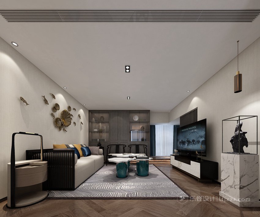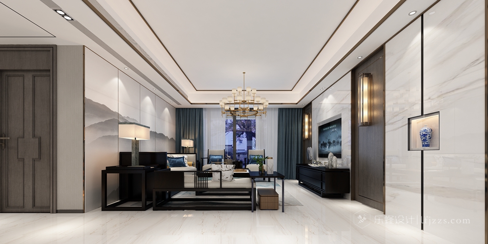電視背景的對稱布局及沙發背景的水墨造型,是對中式風格的致敬,而簡約的燈具及頂部不銹鋼線條的裝飾亦是對現代的詮釋;深色的明代家私配以灰色系的地毯,色彩柔和但不平淡。