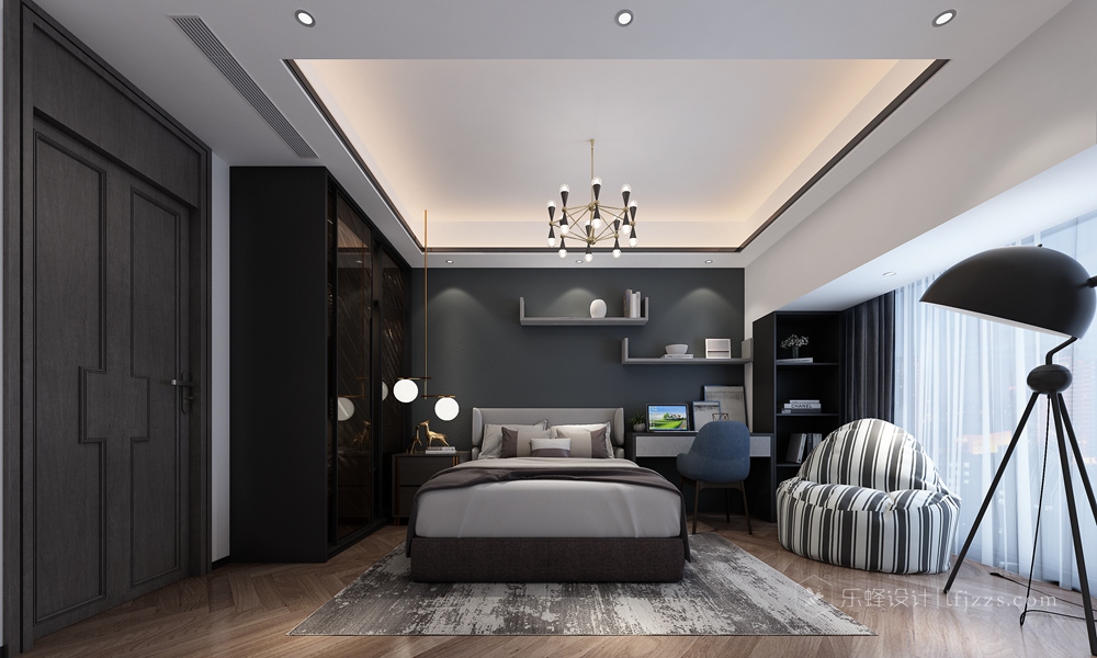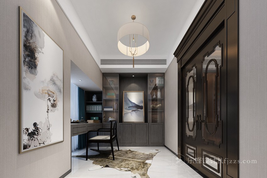 書房美觀與否將會對全屋格調產生很大的影響。考慮到書房的功能性重疊,所以周工將書桌放置在窗側,不會影響采光,還可給中間留有足夠的活動空間。