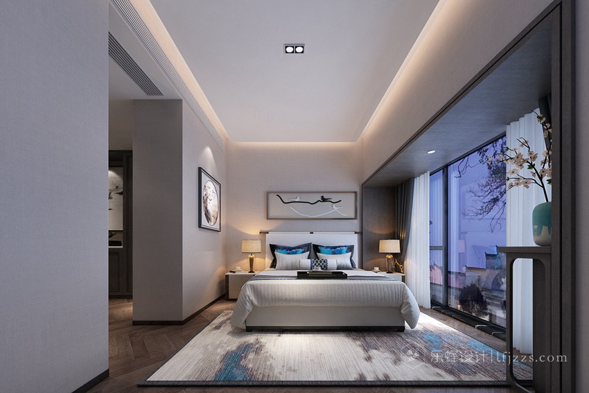 過道頂面L形反燈槽的設計,像是進入臥室的指引。跟隨燈光來到主臥,即可見到這個用舒適與溫馨打造出的睡眠區。全景落地窗將窗外美景一攬入懷,讓這波瀾壯闊臣服于主人麾下。能在此處安度余生,美哉美哉!