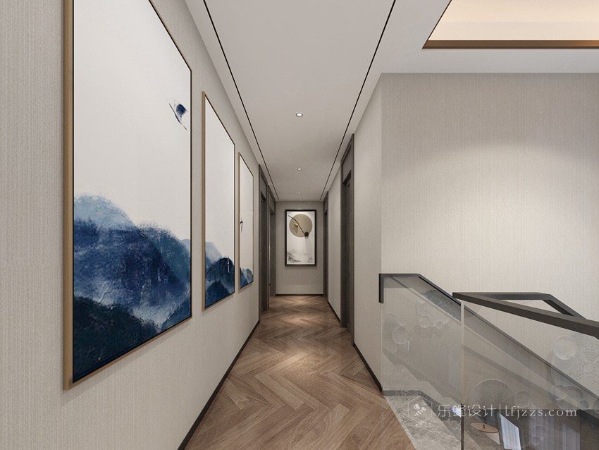 順著鋼化玻璃扶手上到二樓,過道未作過多的修飾,僅用柔和的燈光、搭配充滿意境的掛畫來營造意境。