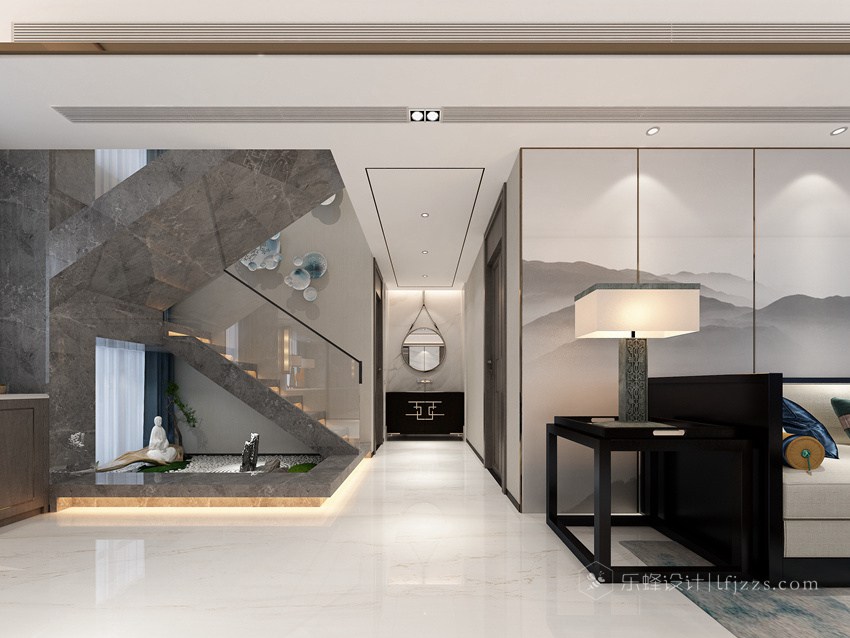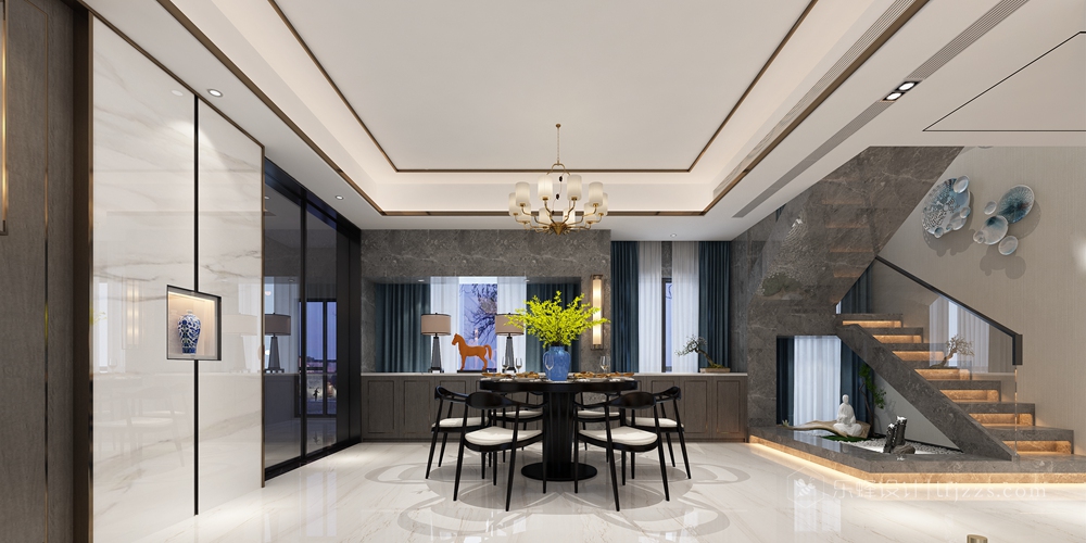 古堡灰的大理石將餐廳的承重柱及反梁和樓梯連到一起,使原本低壓的空間得到緩解,還增加了整個住宅的檔次。樓道的端景頗具禪意,再輔以柔和的暗藏燈光,這異于常規的設計,可讓居者心境更加寧靜。