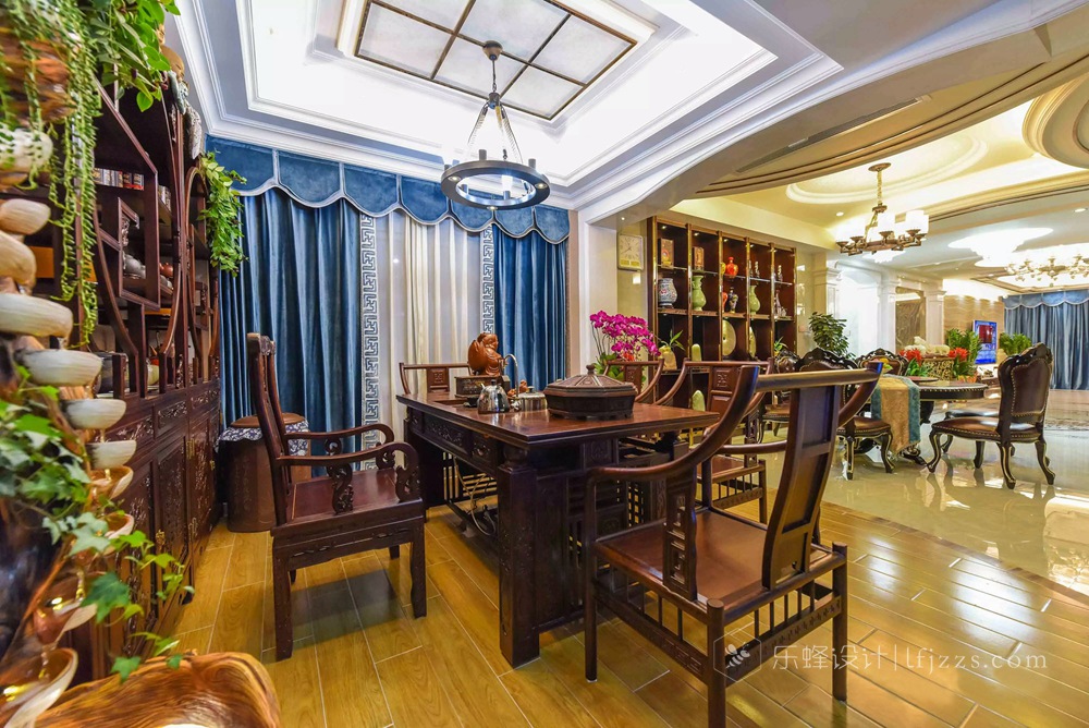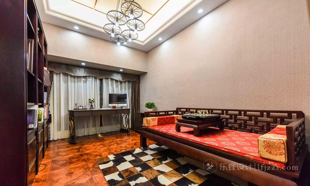 - 書房實景圖 - 書房的設計的定制書桌、書柜,將主人的藏書得以安放,并因古典木紋地質地和肌理,烘托別樣的體驗。