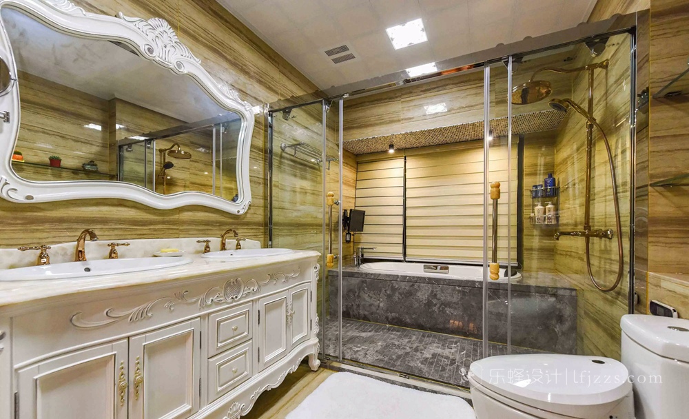 - 衛生間實景圖 - 為滿足屋主需求,衛生間打造歐式典雅造型。劃分功能區,并結合淋浴功能,做到干濕分離;盥洗臺下方是收納柜結構,方便各種儲物需要。
