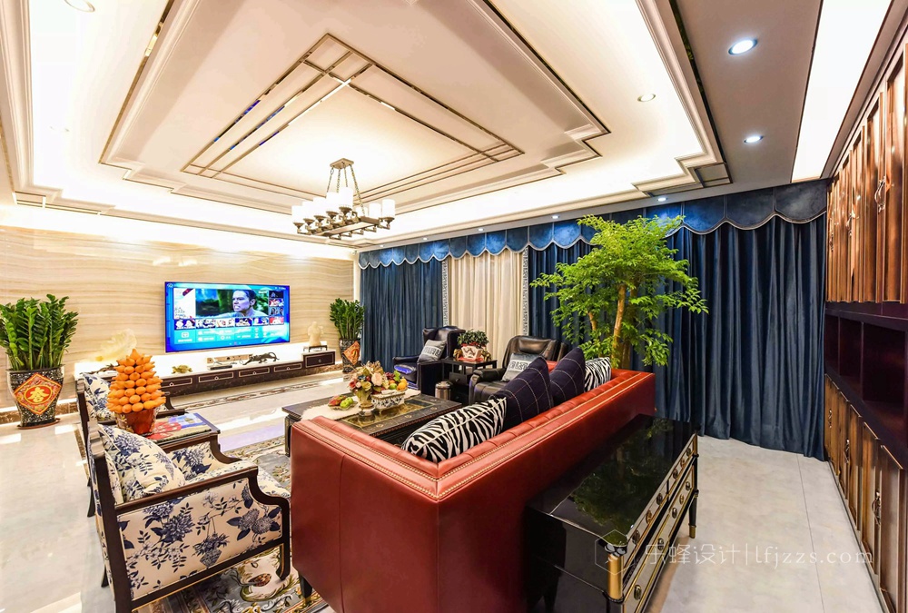 - 客廳方正大氣,一副中式寫意圖將主人的生活體現得淋漓盡致,而中性色現代沙發、布藝,因為黑色茶幾和白色水晶燈而現代精致,讓生活更有溫情。