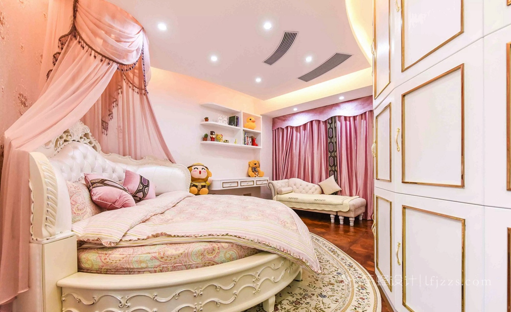 - 兒童房實景圖 - 兒童房以乳白為背景,搭配乳色床上用品,粉色的設計,更為素凈和甜美;俏皮童趣的床帷搭配可愛的卡通玩偶,營造了一個夢幻、童真、舒適的空間。
