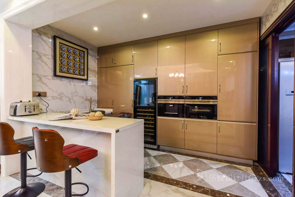 - 吧臺實景圖 - 吧臺打造一種餐廳的意境,考面包吃早餐,顯得十分清新自然;并以電光照明的方式,照耀著壁柜,烘托了閑適氛圍。