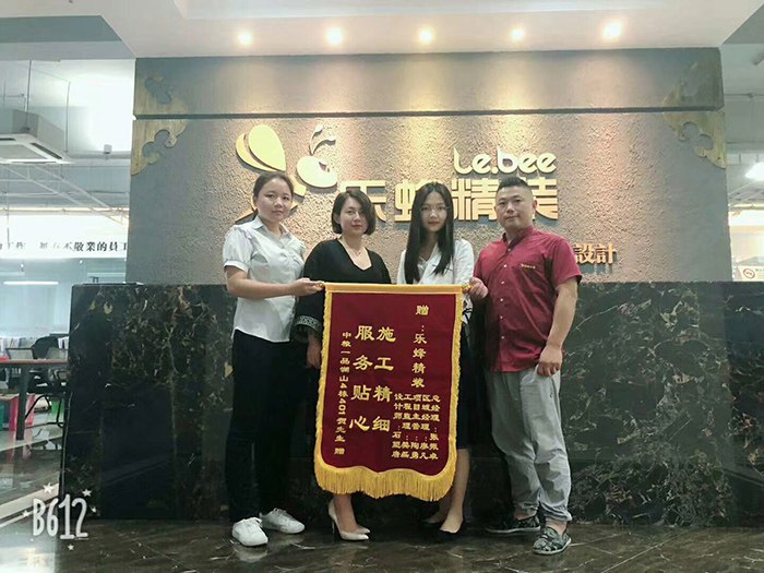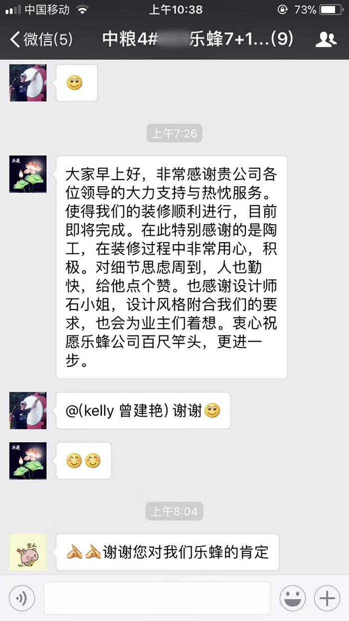 大家早上好,非常感謝貴公司各位領導的大力支持與熱情服務。使得我們的裝修順利進行,目前即將完成。在此特別感謝的是陶工,在裝修過程中非常用心,積極。對細節思慮周到,人也勤快,給他點個贊。也感謝設計師石小姐,設計風格符合我們的要求,也會為業主著想。衷心祝愿樂蜂公司百尺竿頭,更進一步。