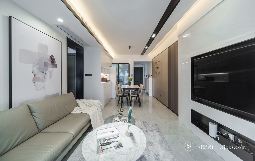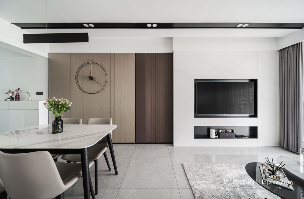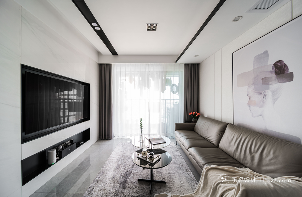 - 經典的黑白灰搭配符合現代人在繽紛多彩的城市追求一份家的寧靜,簡潔且舒適。沙發的皮質柔軟跟電視背景墻的硬朗質感對比鮮明,小對比映襯出大道理。