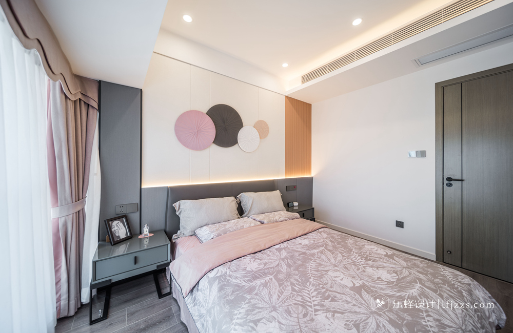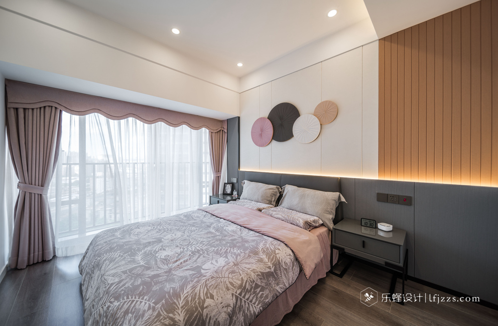 - 主臥實景圖 - 主臥以灰色與木地板搭配,床頭背景墻以棕色與白色的搭配,在布置上不同顏色的裝飾品碰撞,床頭暗藏一層燈帶,平時晚上起來就開這個燈就可以滿足照明,也不用打擾到其他人。