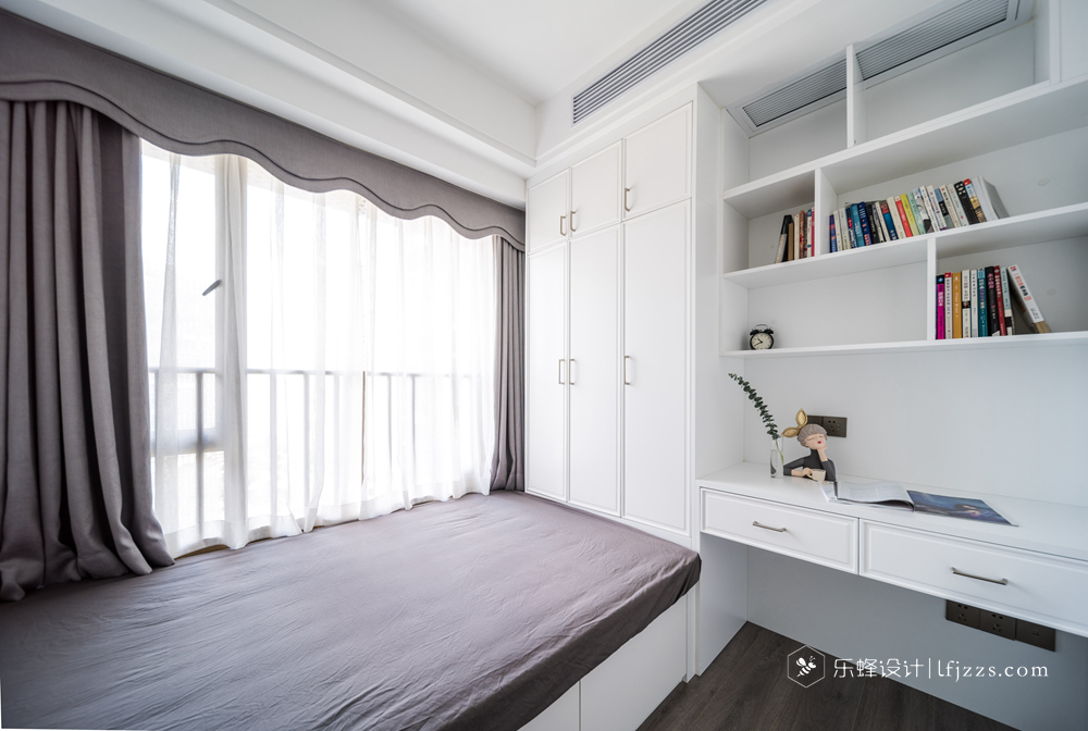 - 次臥實景圖 - 空間看似簡單,卻巧妙地運用了色彩去營造舒適的視覺效果。采用榻榻米的形式連接著一個頂天立地的櫥柜,巧妙的搭配上一個小桌子,即滿足了收納空間也看起來更違和,大氣。
