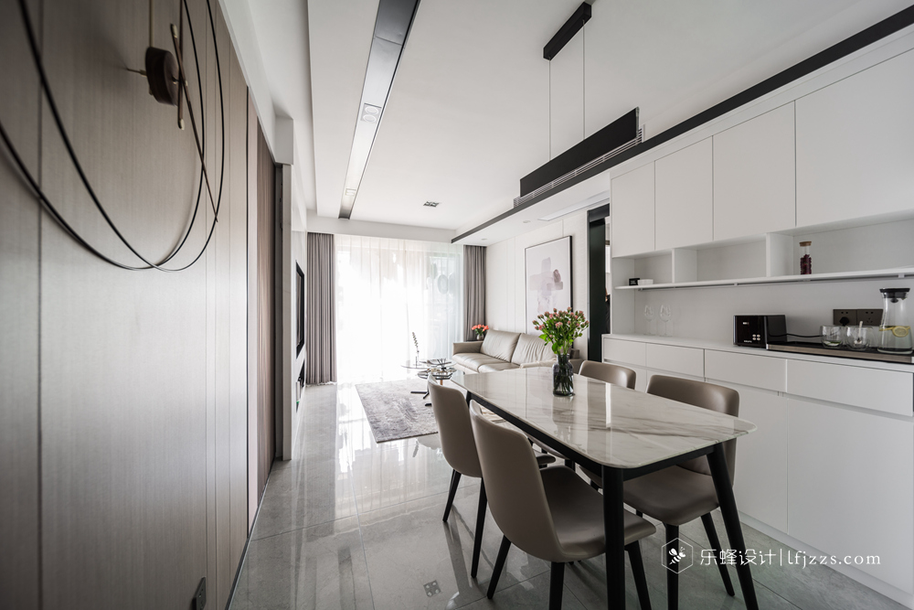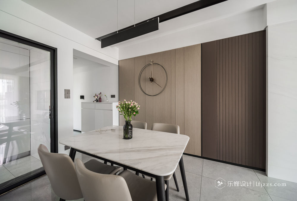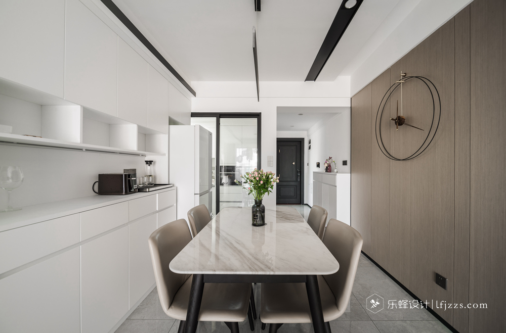 - 餐廳實景圖 - 餐廳在和客廳統一格調的情況下兼顧區域特色,采用花紋大理石與原木色的碰撞,色澤統一風格,木紋的質感仿佛在拉進畫面視覺的柔軟,餐桌采用白色大理石帶一絲絲灰色,與整個空間遙相呼應。
