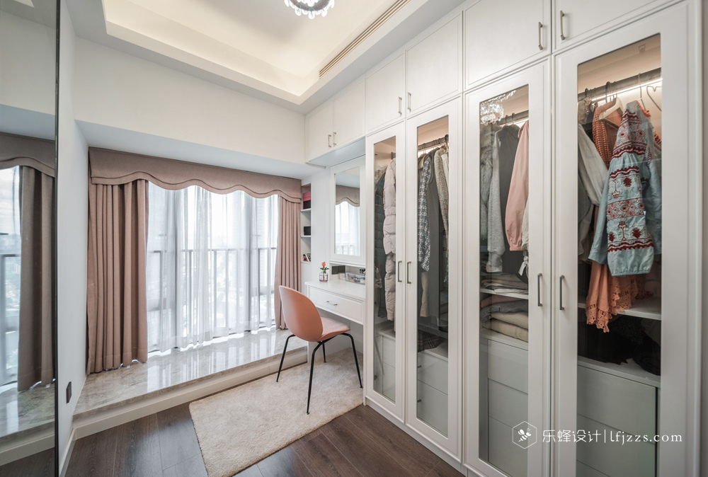 - 衣帽間實景圖 - 衣帽間延續整個空間的風格,做成拉手式的把手,透明玻璃的搭配,使得更容易的找到想要的東西,梳妝臺以白色與粉色凳子的搭配,使得空間更加的俏皮。