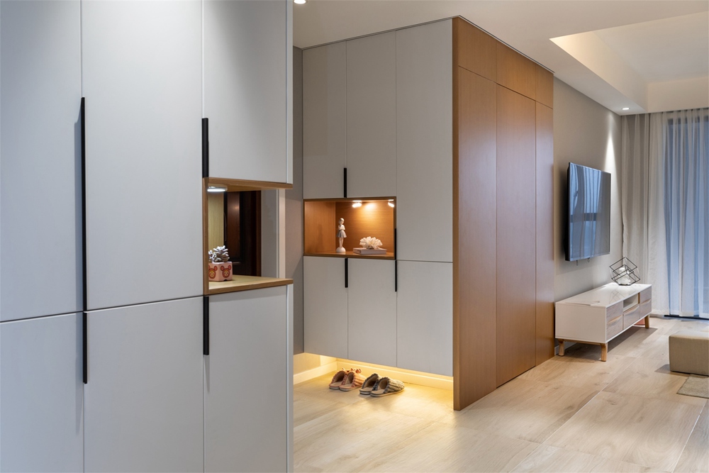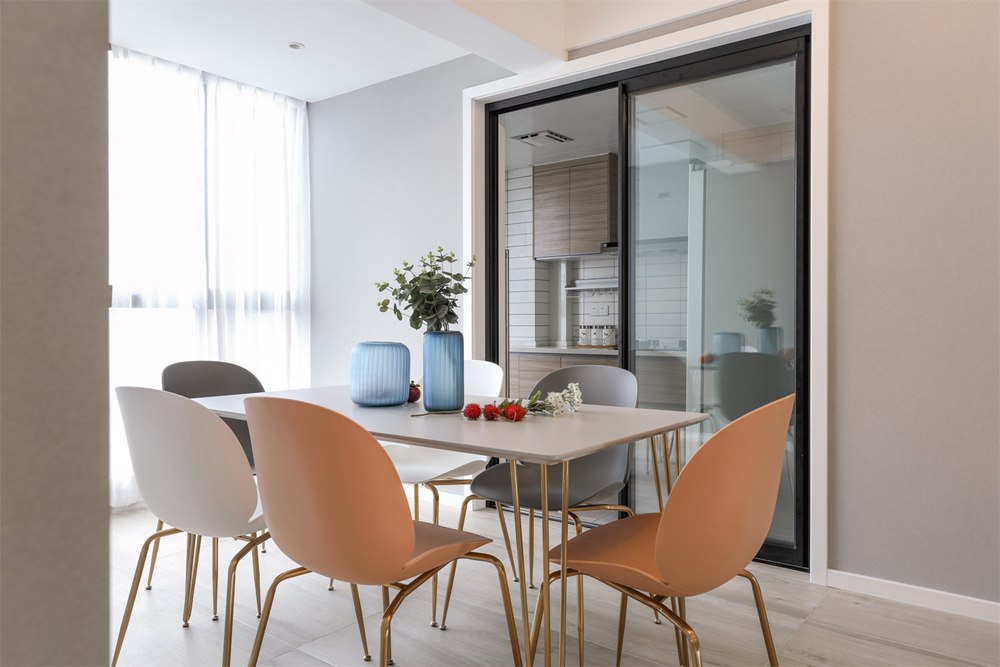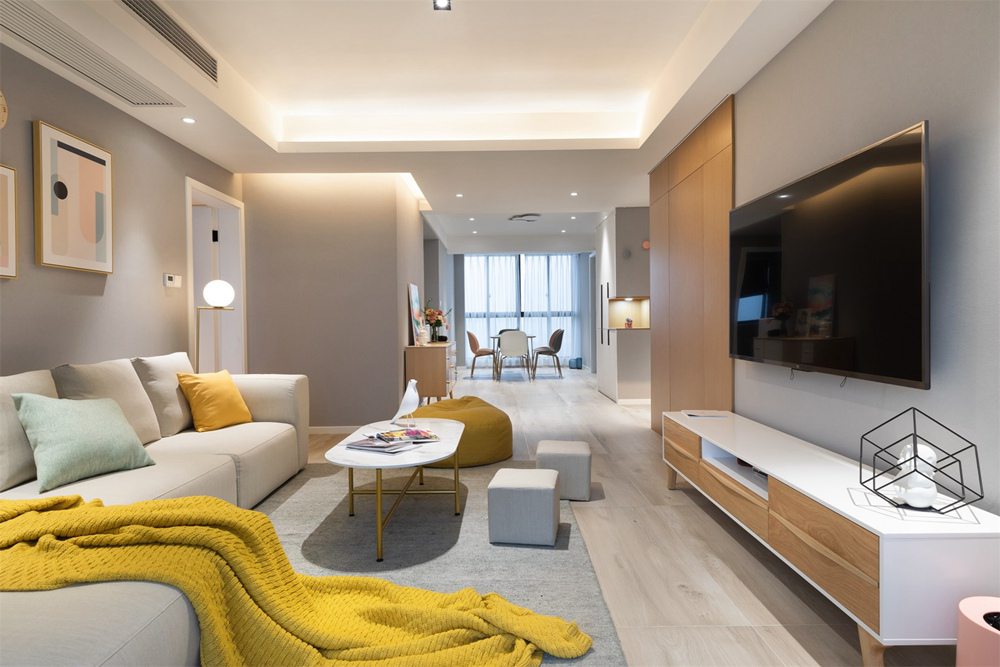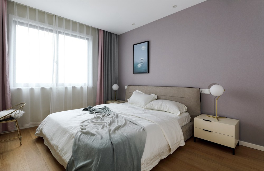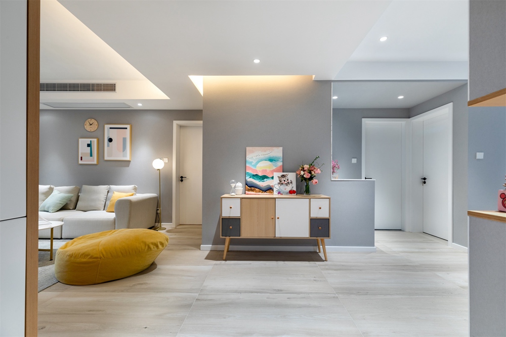 北歐風格以淺色為代表,整體感舒適自然,同現代風格有著極大的相似,頗受現代年輕人的喜愛。北歐風格的裝修沒有過多冗雜的裝飾和花紋,用一種最簡單、直接、功能化且貼近自然的線條來表現其寧靜的北歐風情。本案以淺灰色為基調,搭配白色、原木色等輔助色,以少量純色作為點綴,整體傾向于淺色系,給人一種干凈明朗的感覺。