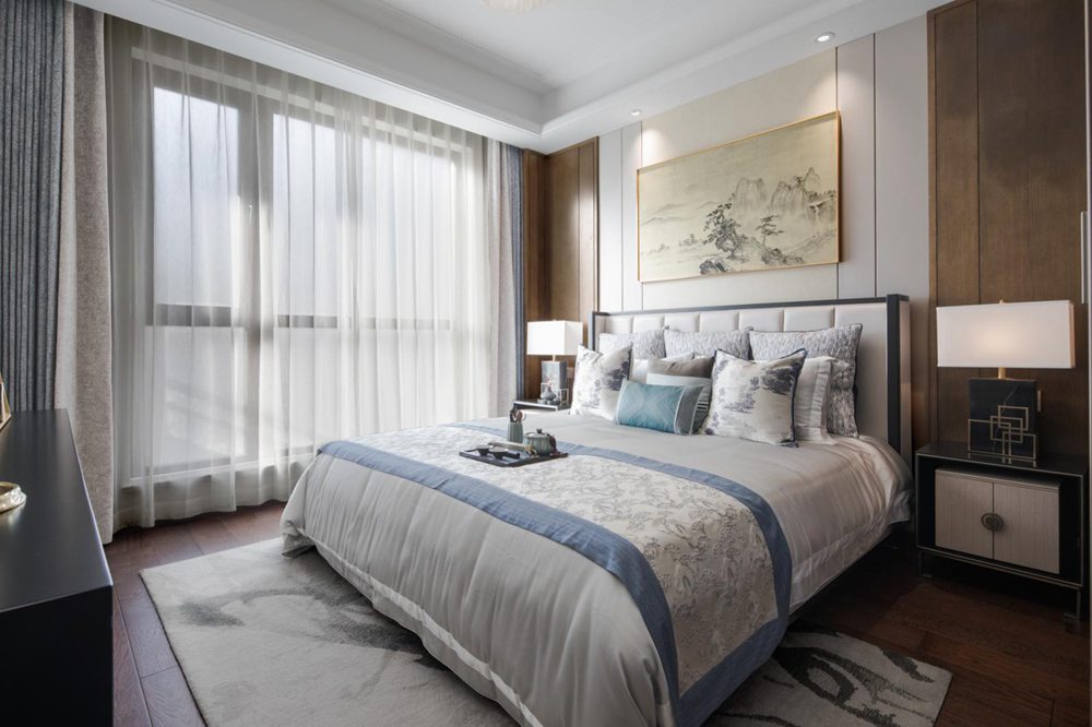 臥室也用山水畫的床頭背景墻來營造平衡、優雅的中式美感