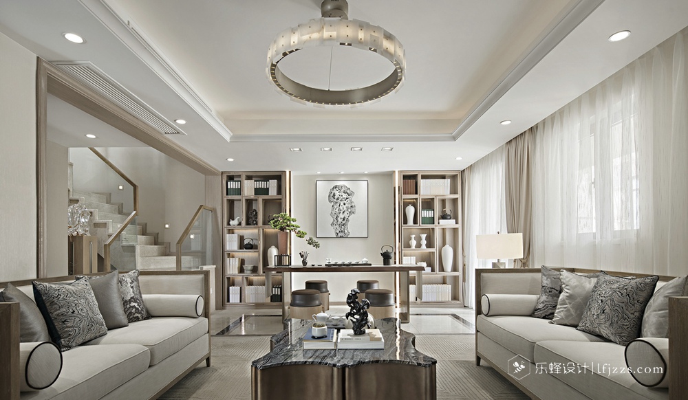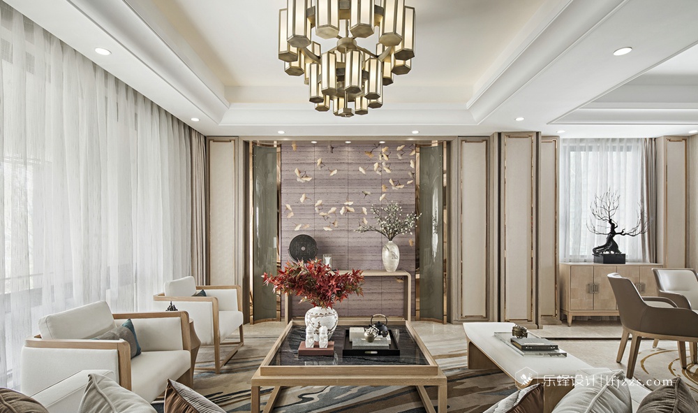 新中式風格從簡單到繁雜、從整體到局部,精雕細琢,鑲花刻金都給人一絲不茍的印象。一方面保留了材質、色彩的大致風格,仍然可以很強烈地感受傳統的歷史痕跡與渾厚的文化底蘊,同時又摒棄了過于復雜的肌理和裝飾,簡化了線條。