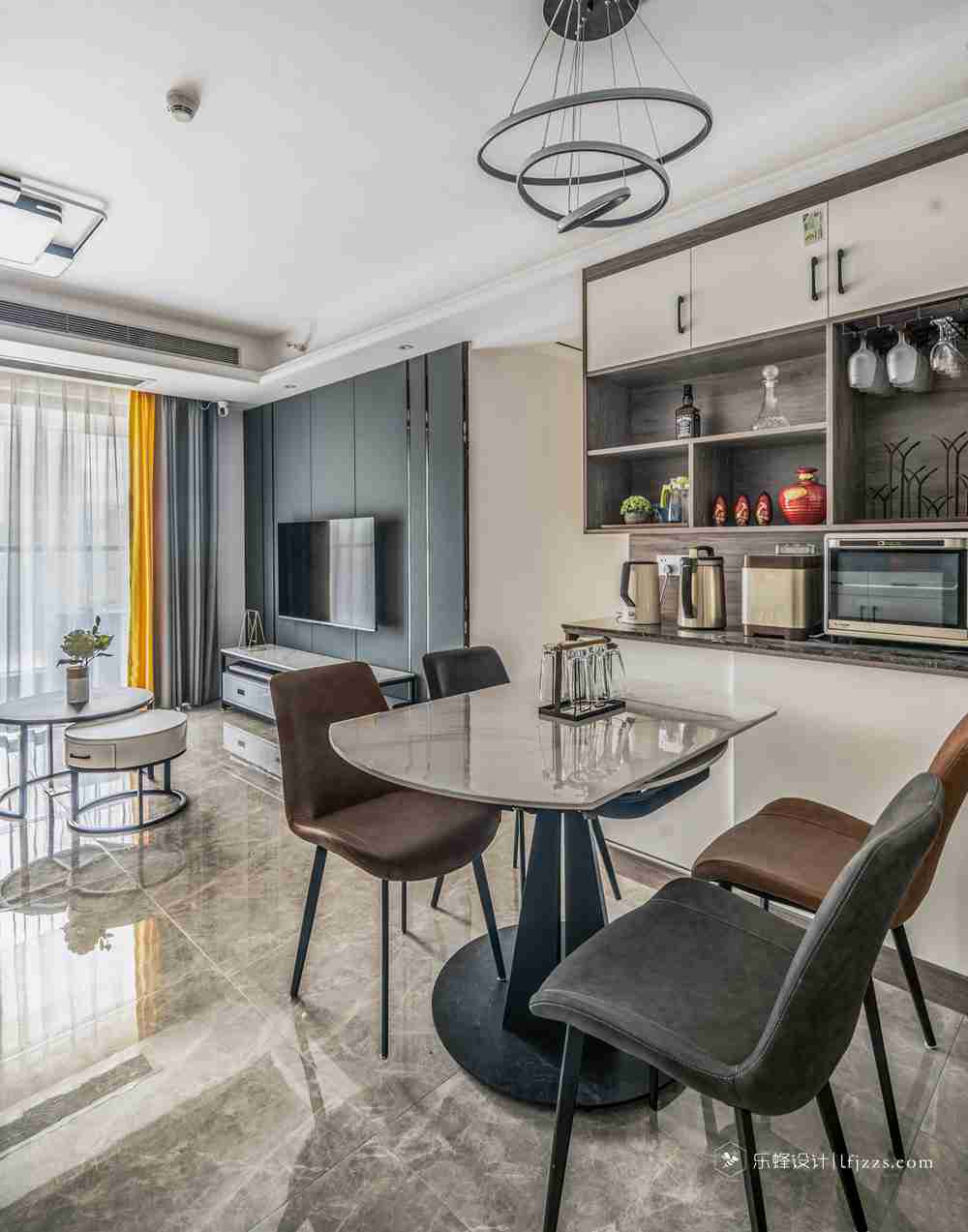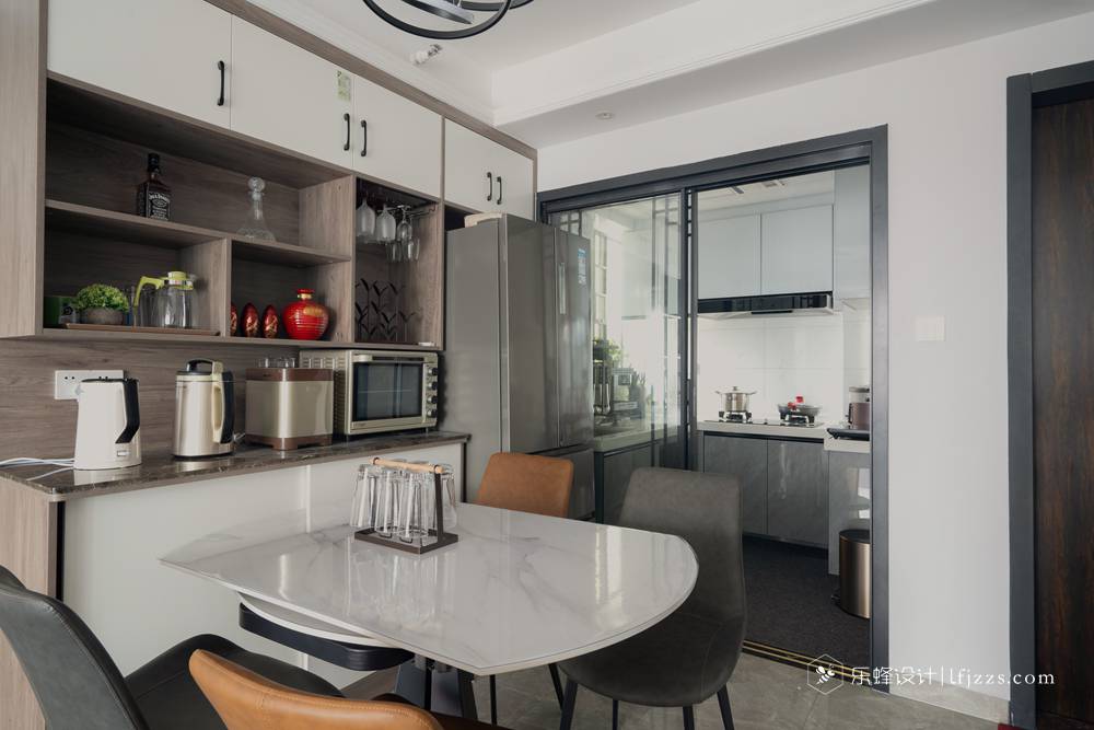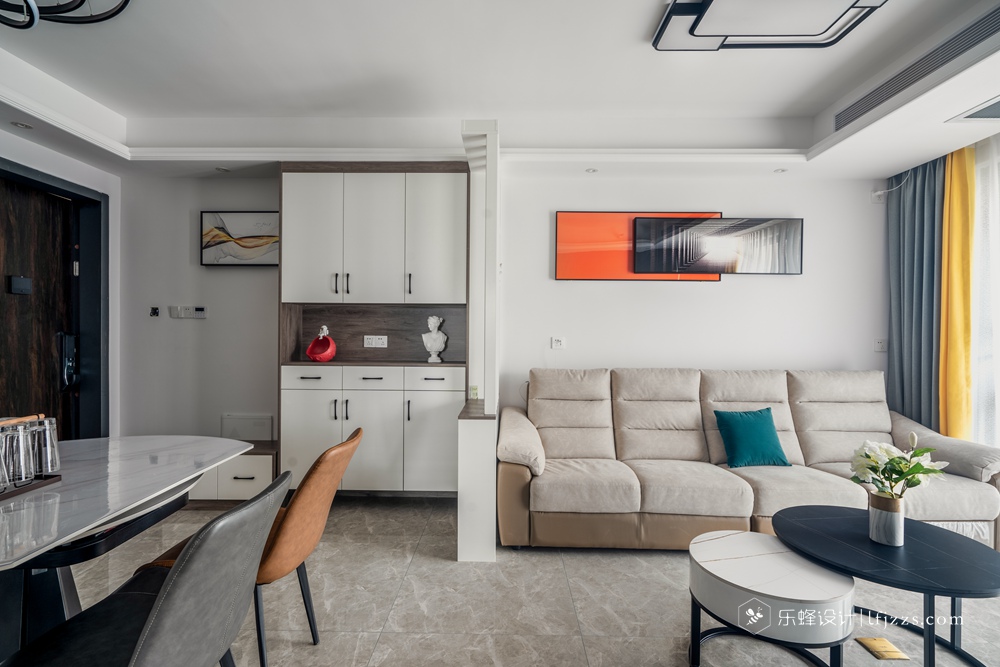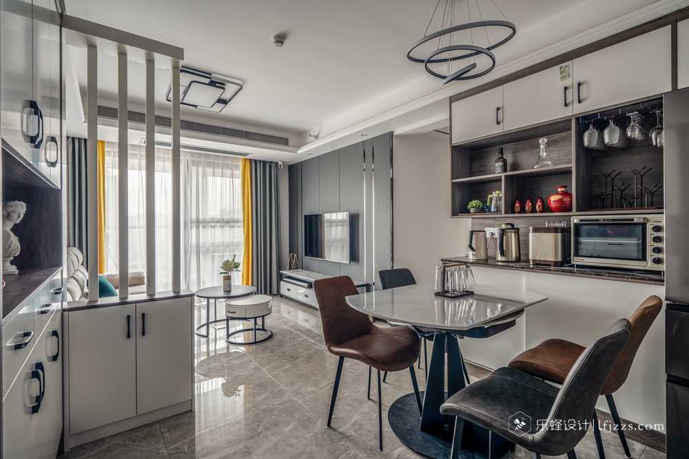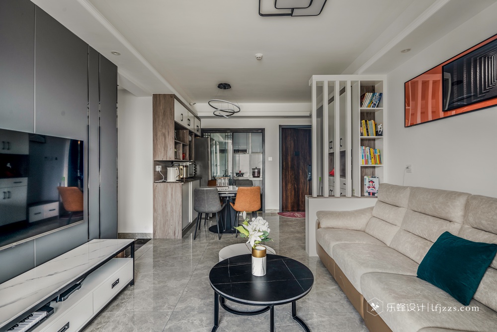 玄關巧妙采用屏風式,客餐廳空間是開放式設計的,既是隔斷,卻隔而不斷。剛需戶型里很多沒有玄關走廊的戶型,但是又需要一個玄關來擺放鞋子和隔斷視線,這是不錯的選擇。
