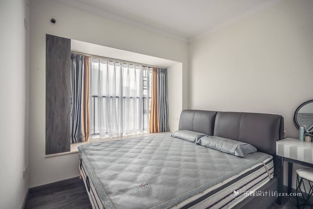主臥空間是足夠大的,應業主訴求,偶爾小孩會跑來和他們一起住,床選擇了2m2寬度。飄窗上設計儲物柜,巧思收納達到極致;梳妝臺與床體相靠,方便梳妝,配色統一。