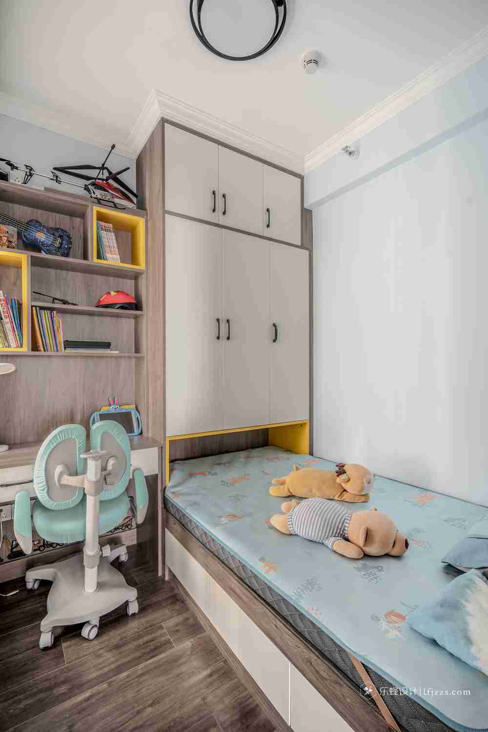 兒童房將衣柜與榻榻米作為一體,給予孩子一個集讀書、學習與收納的多功能空間。