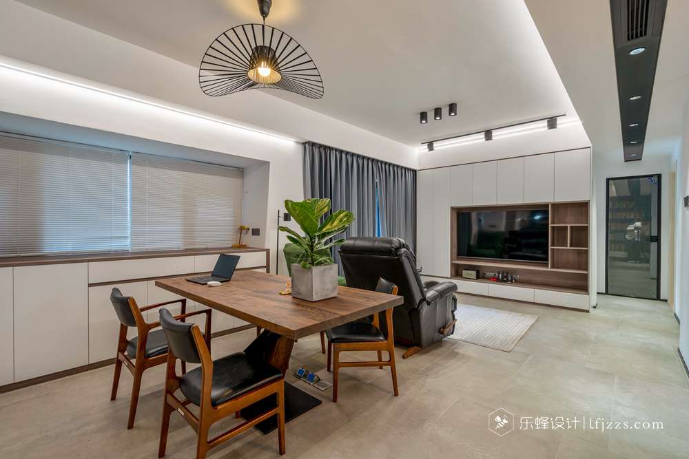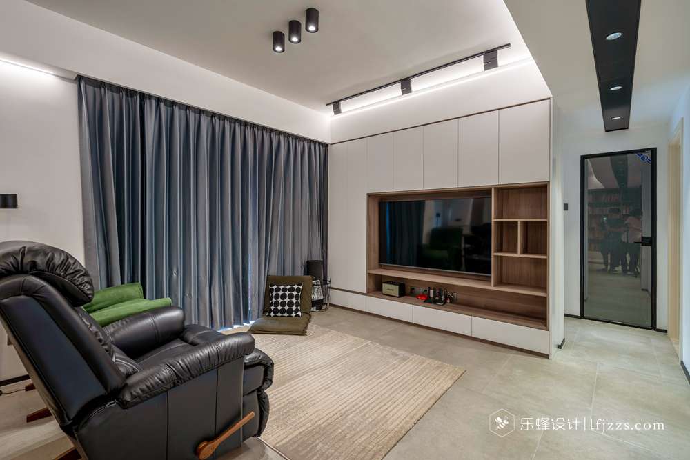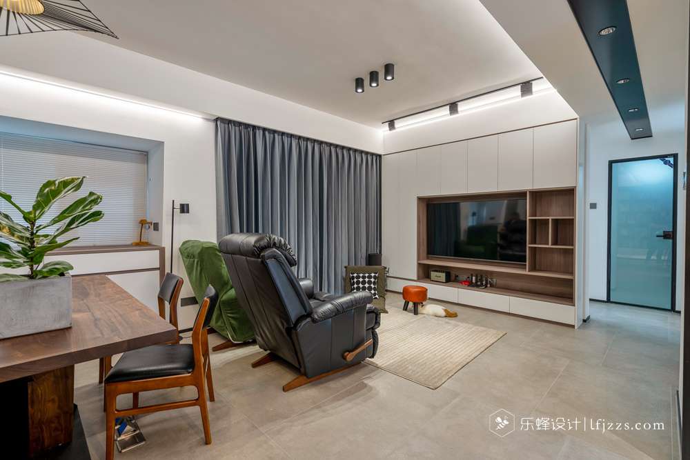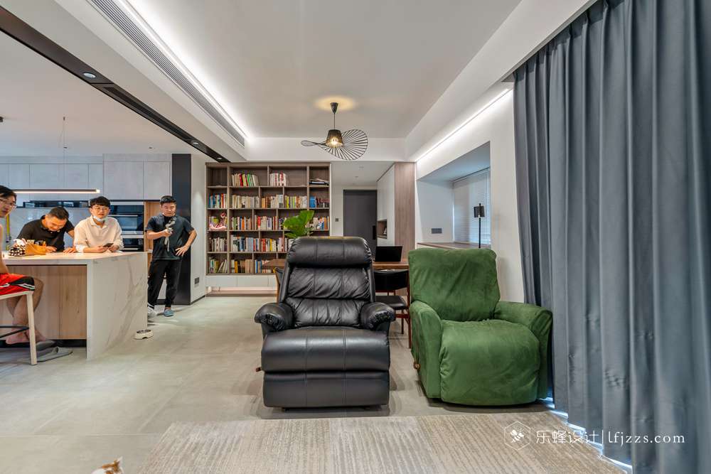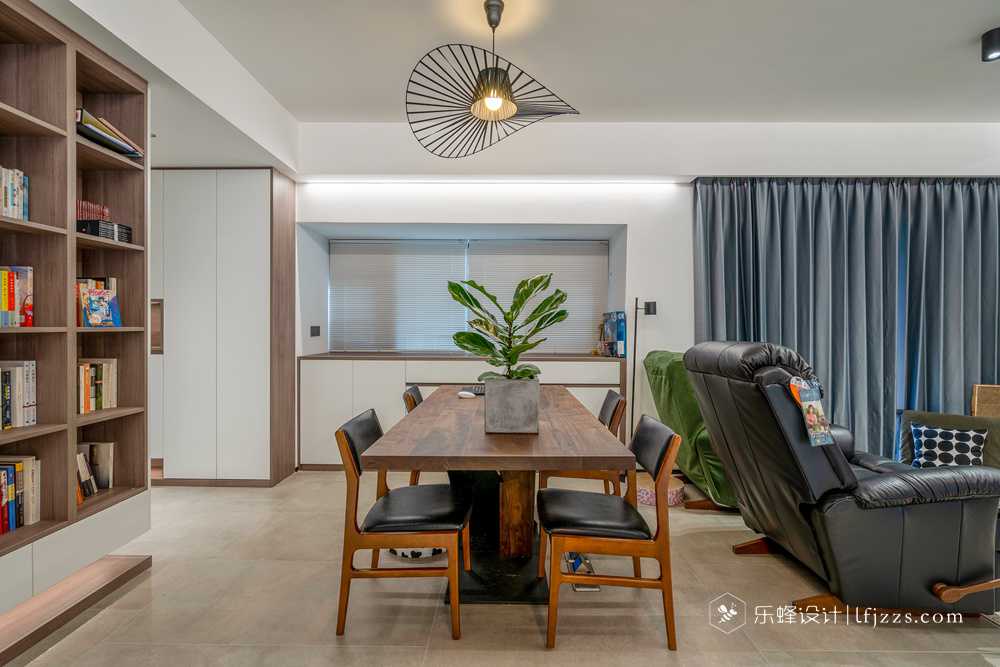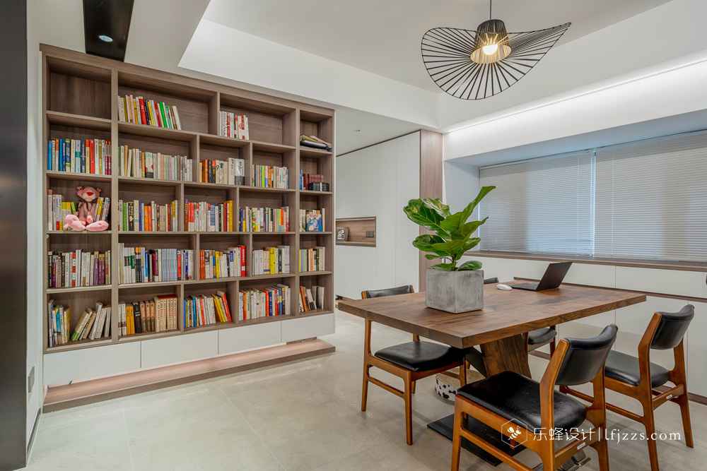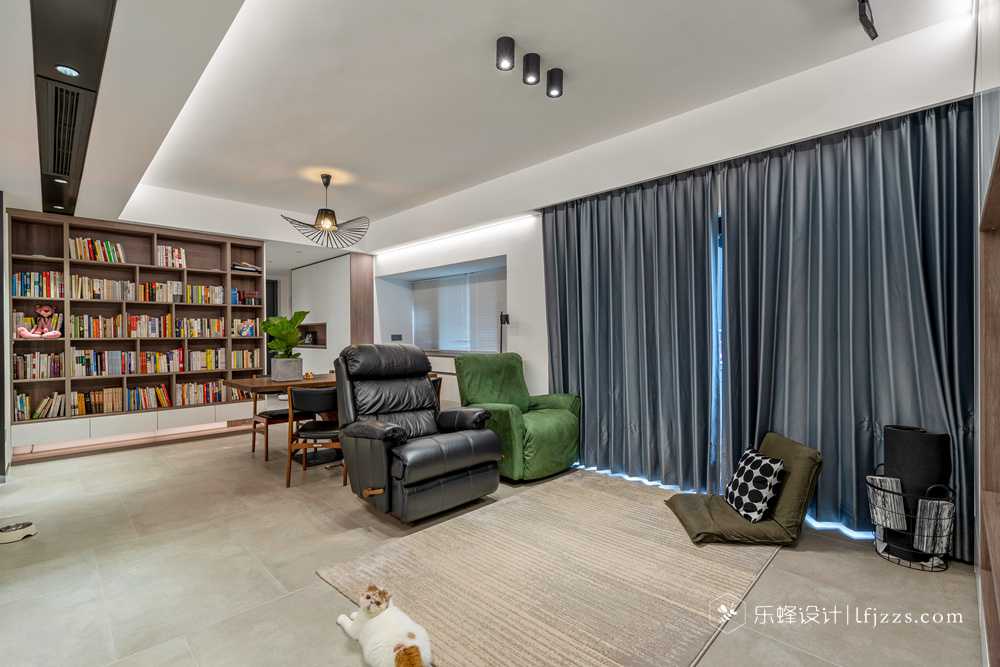 開放式的客廳空間充滿了包容性,容納著大量休閑與讀書的區域,業主平時喜歡讀書,書柜設計也有效有序的起到整理收納的作用,讓家中看起來整潔利落。