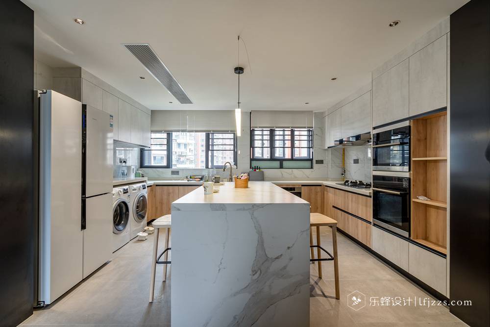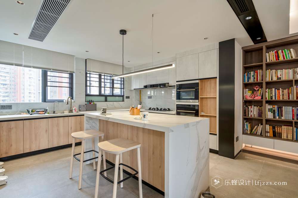 - 廚房實景圖 - 把廚房做成開放式和客廳融合,兩者交接處設計吧臺餐桌,閑暇時在此喝茶、小憩,實現餐廚娛樂一體化。
