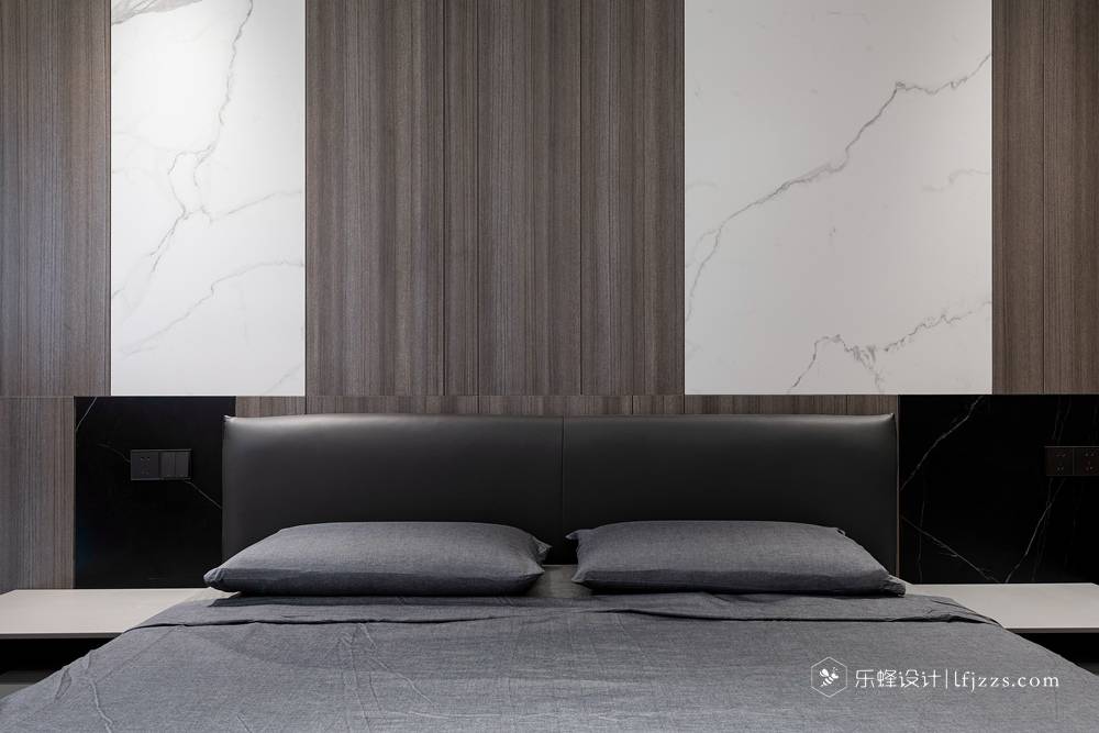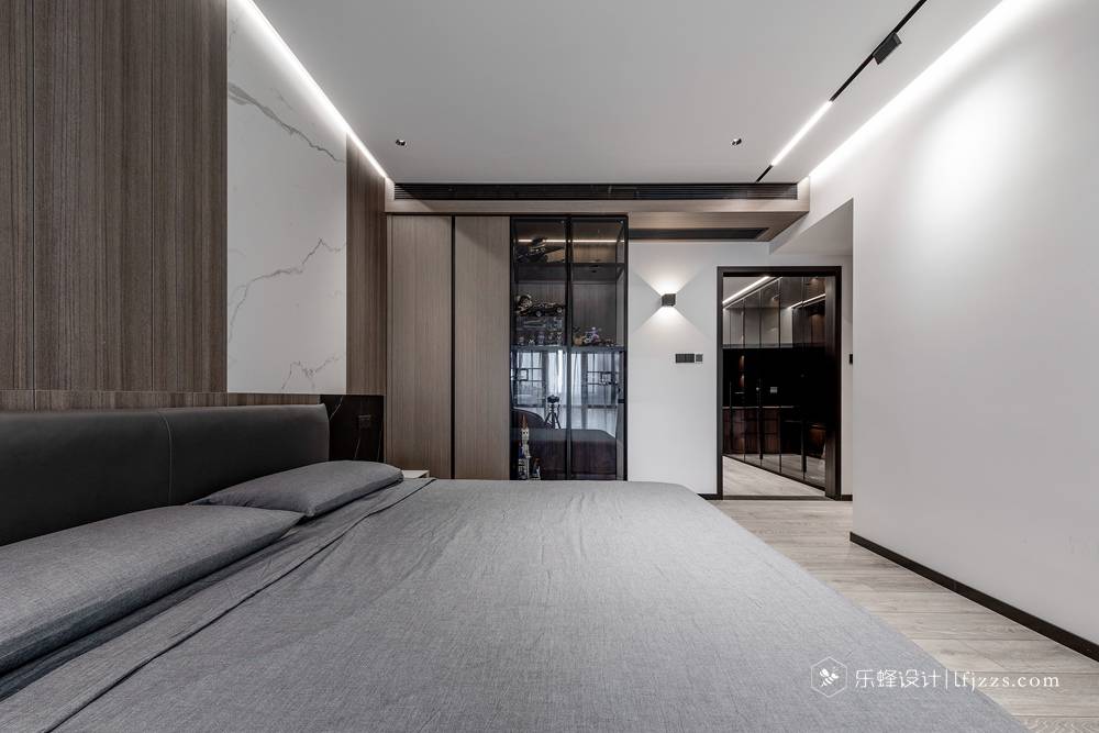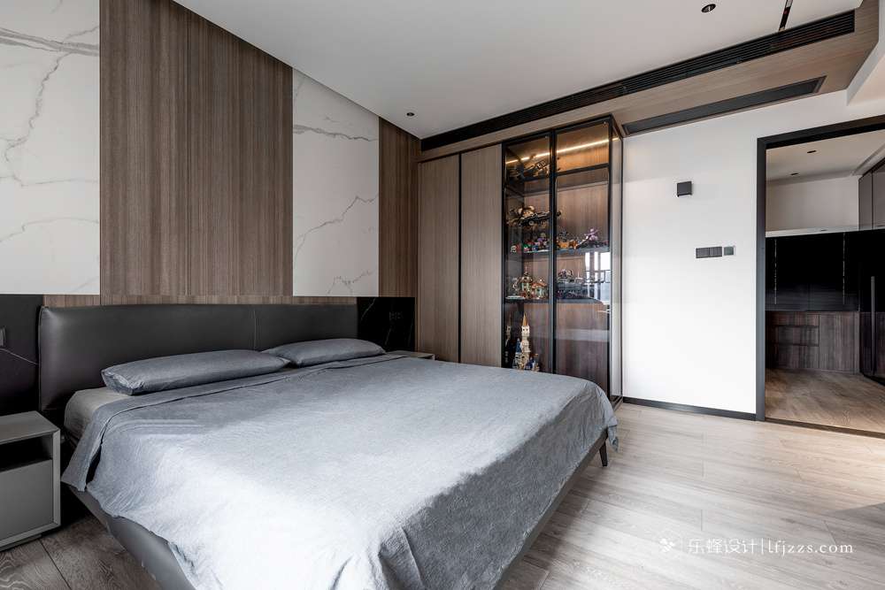 - 主臥實景圖 - 臥室采用木地板加上黑色的門檻,背景墻采用大理石和原木的碰撞,使得整個背景墻看起來更加的大氣,在轉角進來的地方做了一個頂天立地的柜子,用上透明的玻璃,因為屋里主人平時會有一些小的收藏品,這樣既有地方存放又可以更直觀的看到心愛的東西。