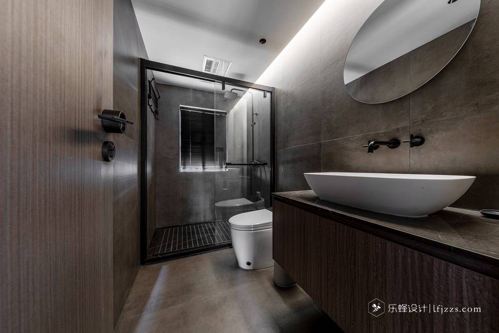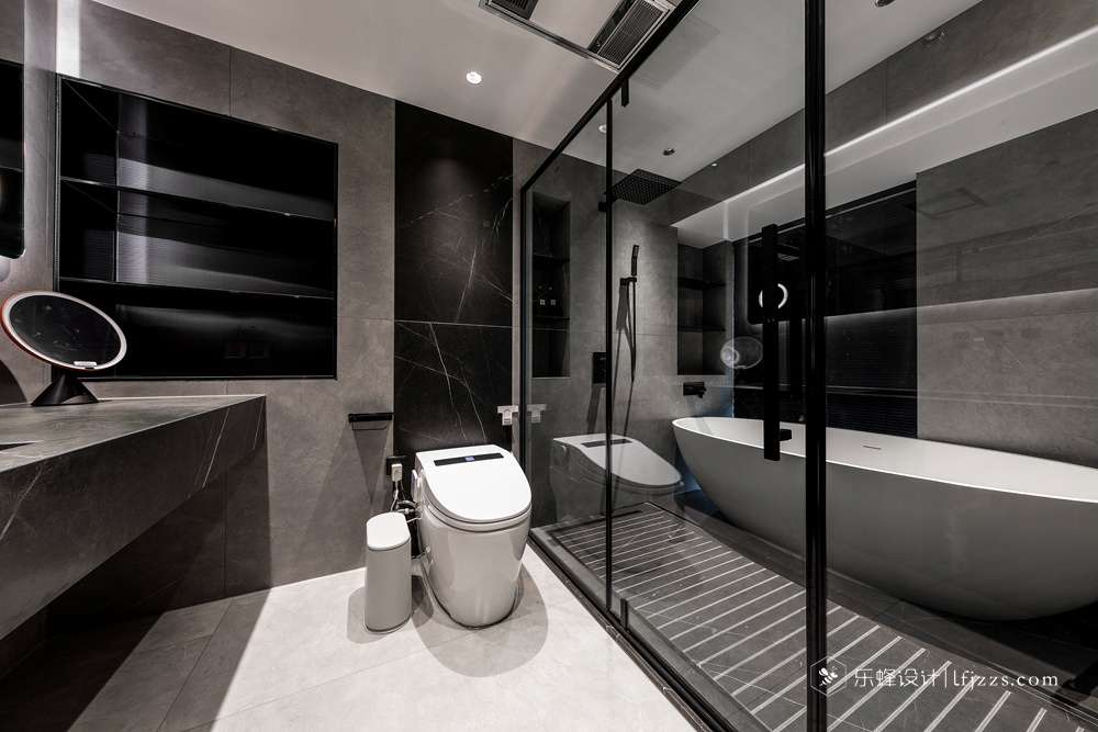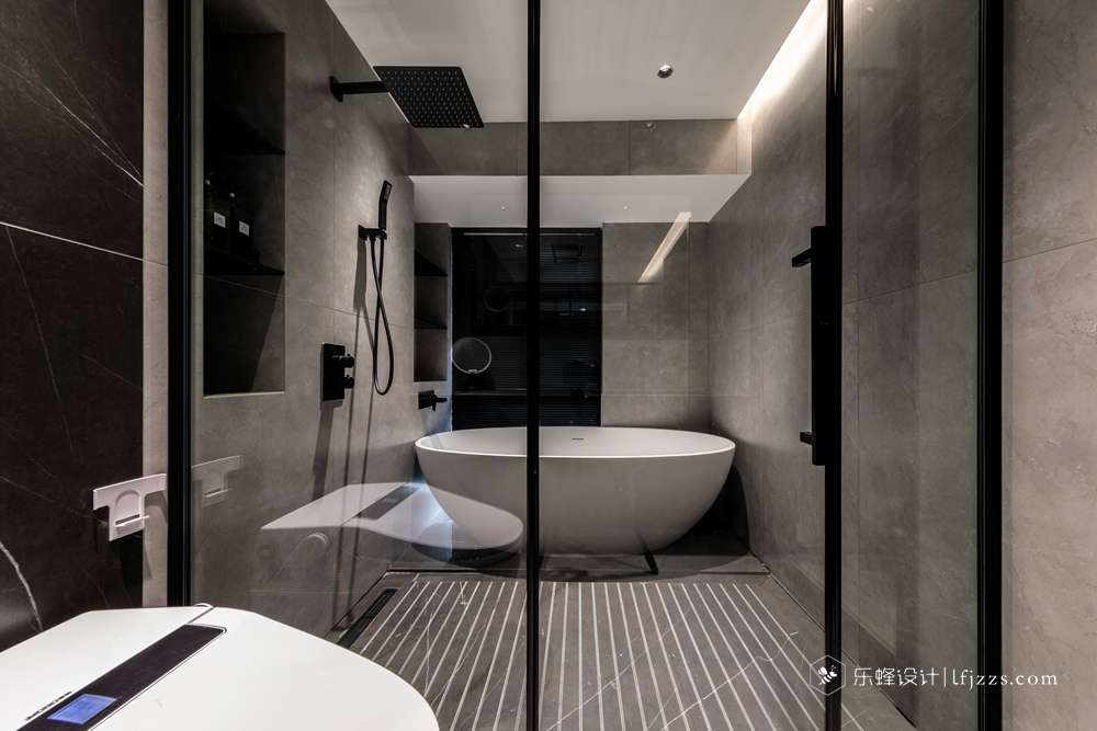 - 衛生間實景圖 - 墻面采用深色的石材與地板完美的融合在一起,采用干濕分離的形式,把浴室跟洗手臺分割開,浴室采用超大的浴缸,下完班可以回家躺在浴缸里面釋放全身的疲憊。