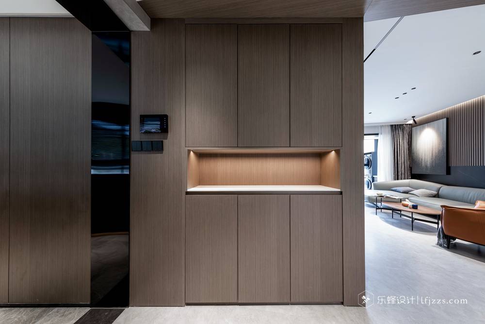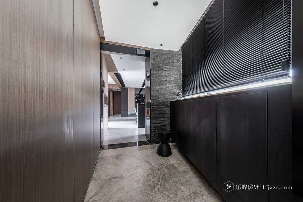 - 玄關入戶門地面采用的是灰色大理石,右邊運用黑色做了一排矮柜,搭配上百葉窗,左邊引用咖色把整個柜子做到了頂部,運用兩種不同的顏色給整個空間形成一種撞色。