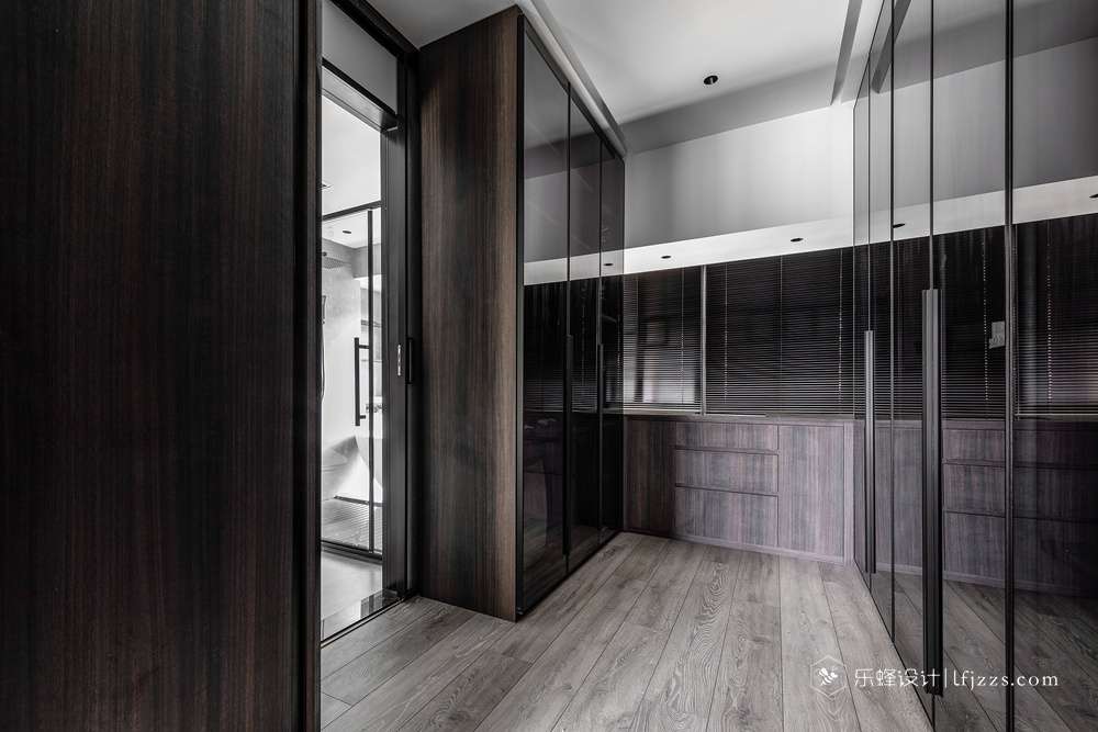 - 衣帽間實景圖 - 女主人用超多的衣物,為她留出來了一個空間作為衣帽間。衣帽間由實木層板與深色玻璃相結合。柜體材質是木飾面,玻璃門與黑色金屬拉手,給人很強的高級感,工藝細膩彰顯簡約品質。