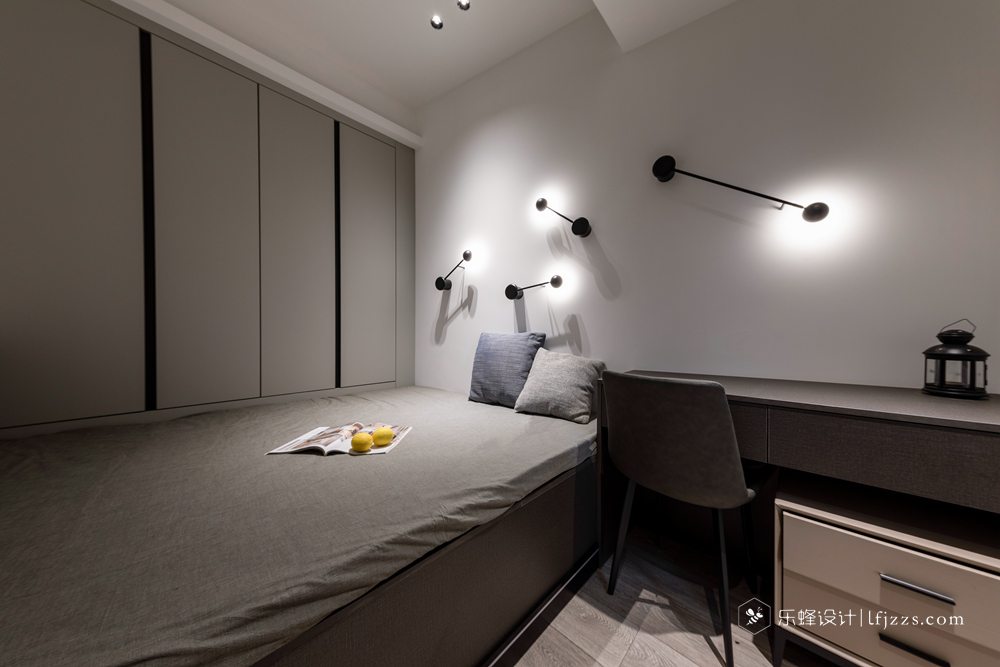 - 次臥實景圖 - 次臥使用床跟柜子結合在一起,即美觀又可以達到更大的收納空間,墻面上面采用了一些簡單的小裝飾,使得墻面看起來簡約而不簡單,旁邊坐個一個小書桌,平時可以在這里看會書,辦會公,這樣也更加的安靜。