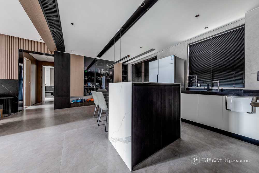- 廚房實景圖 - 廚房是開放式的廚房,中間凸起部分的墻體采用灰色瓷磚,既遮蓋了戶型墻體的凸起異樣感,又利用黑白灰的特性讓空間看起來更加的高端。