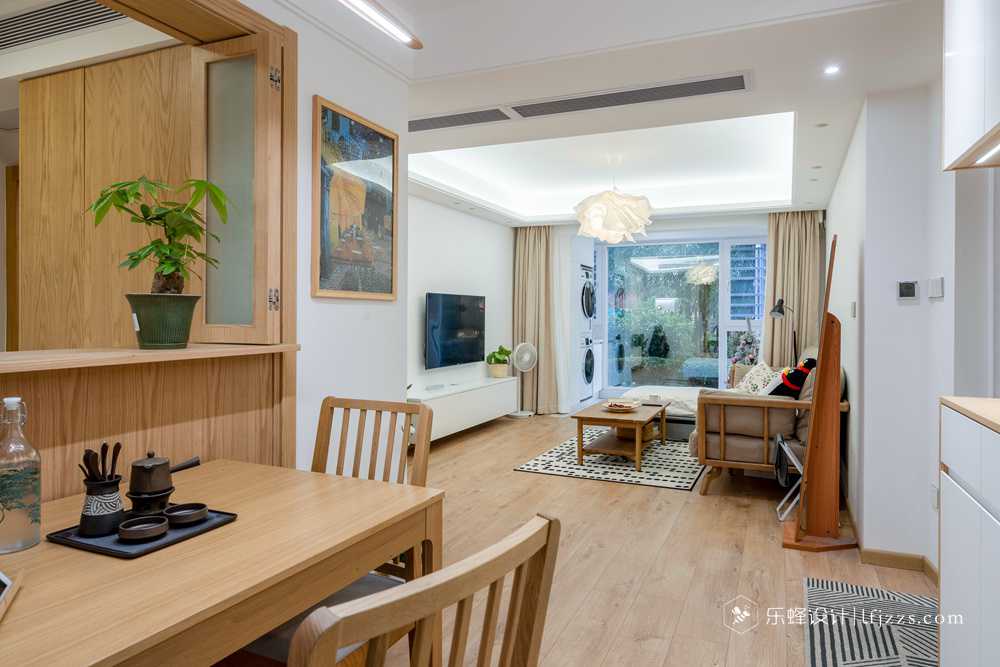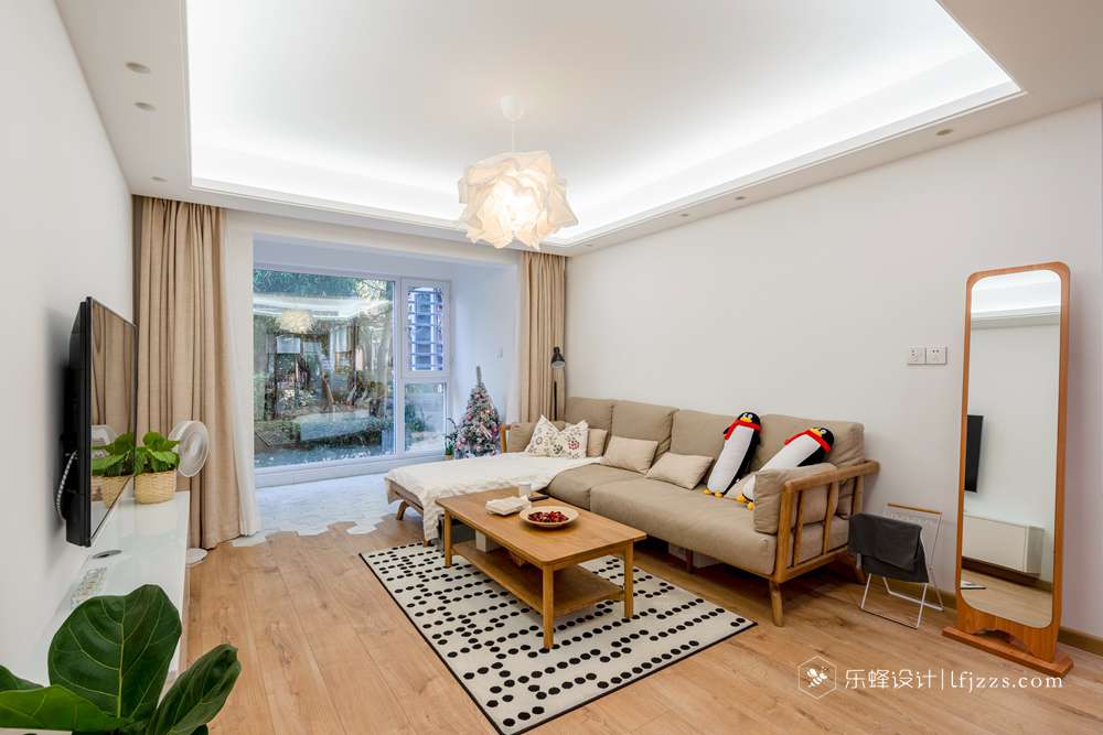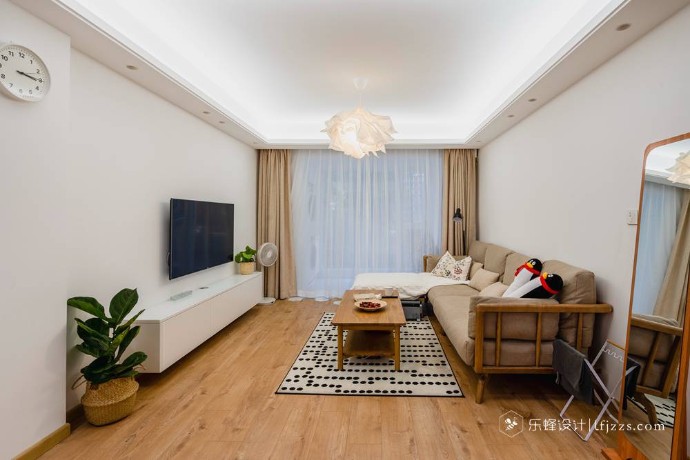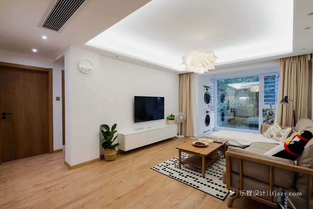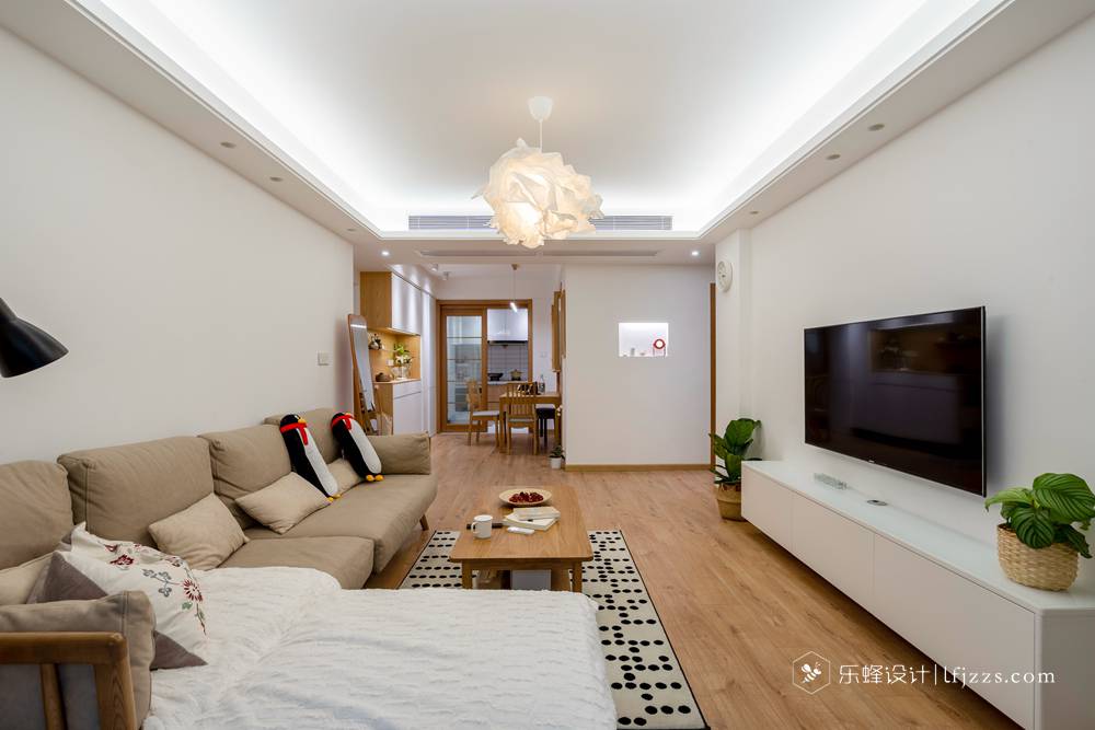 - 電視柜做懸空,營造空間立體感和輕盈感。白色與木地板的搭配,配上淺色的沙發,整個空間仿佛融合在一起。視覺上也舒適開闊。