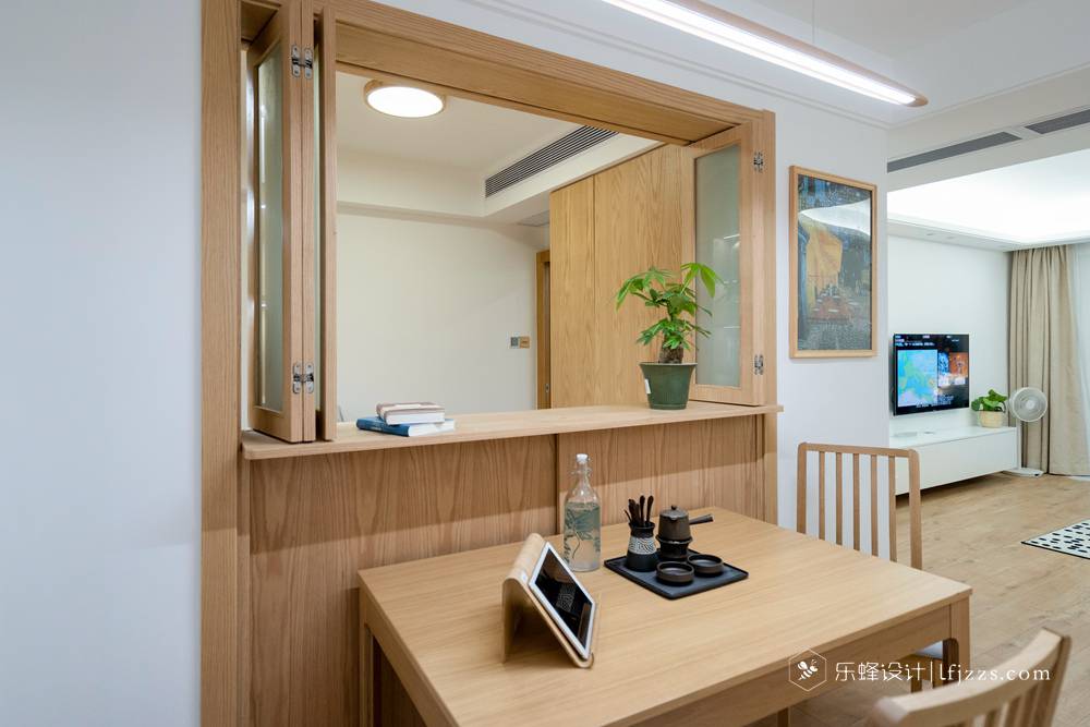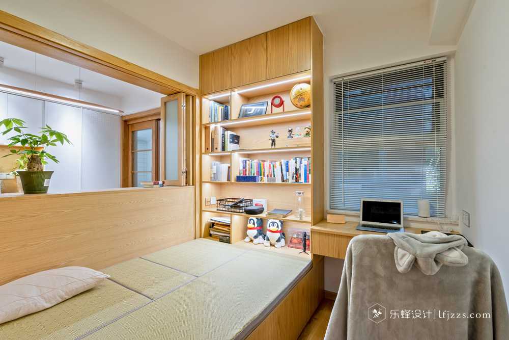 - 書房實景圖 - 書房采用榻榻米的樣式,沿用整個空間的設計,靠墻做上一個書柜,并在每個格子里面做上了暗藏燈帶,還把書房的窗開在了餐廳的上面,這樣把兩個空間的光源都可以聚在一起,顯得空間更加的明亮。