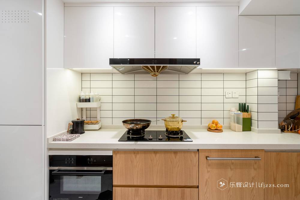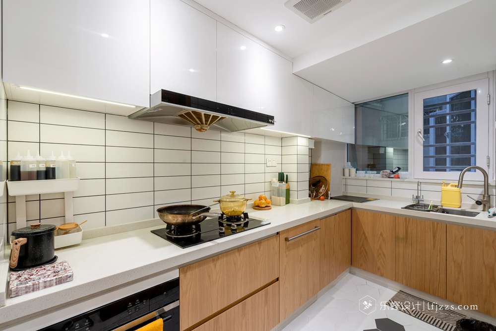 - 廚房實景圖 - 白色墻磚搭配木色的櫥柜會有材質的碰撞,地面上的黑白碰撞的瓷磚也在空間中點綴。廚房面積局促,形成L型的流暢動線,采光通風都很好。延續整體風格,并上下做滿櫥柜,大大滿足廚房的日常收納。