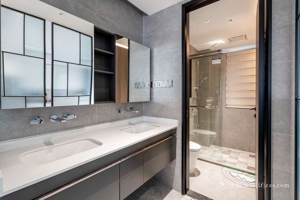 主衛設計打造兩個對稱的圓鏡,美觀且柔和,這樣設計替代了梳妝臺的空間。