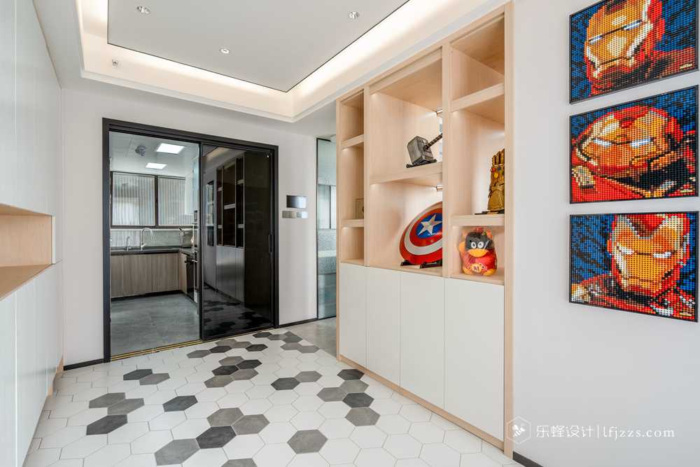 六角形地磚以不同顏色拼接鋪設,形成斑點圖案,隨處可見的漫威元素作為裝飾,家的氛圍格外酷。