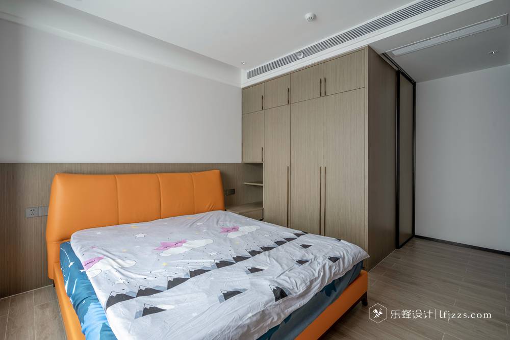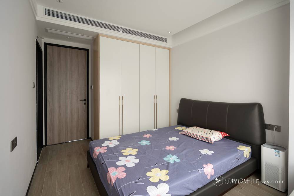 主臥打造一體式的床頭柜,更好的貼合空間。懸浮式床頭柜的好處減少衛生死角,空間整潔,打理方便。床尾定制一整套的木飾面板,隱形門的加入,隱藏生活的慌張一面。