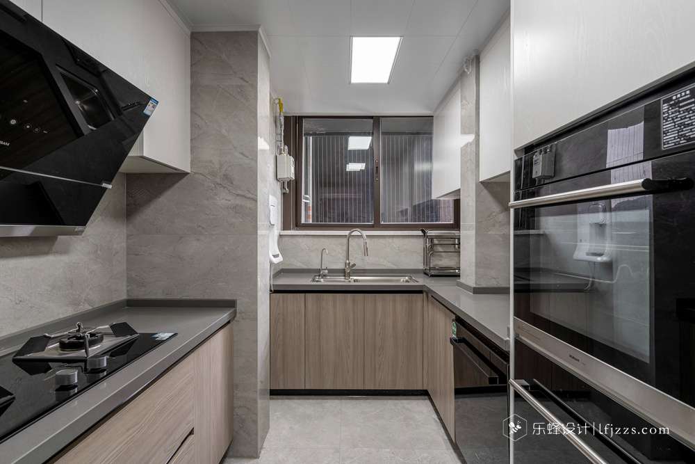 進門處經過玄關就是廚房的空間,空間以黑色鋼化玻璃門做隔斷,合理動線設計,兼顧了每個功能區的獨立,實用主義與美學態度達成高度統一。