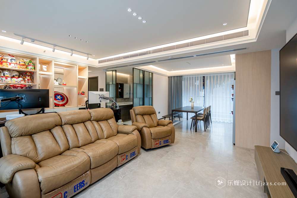 客廳空間沒有添置茶幾,只有皮質沙發與電視,符合年輕人個性與自由的調性,同時也給居住者更多發揮空間。