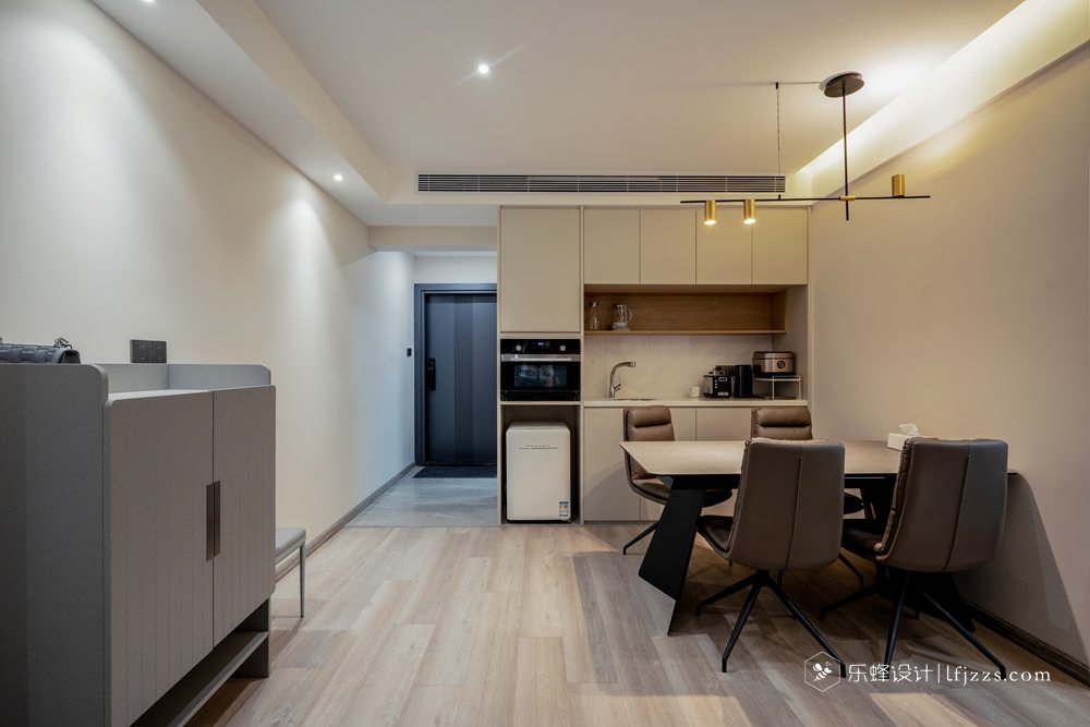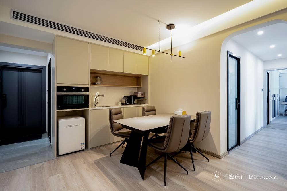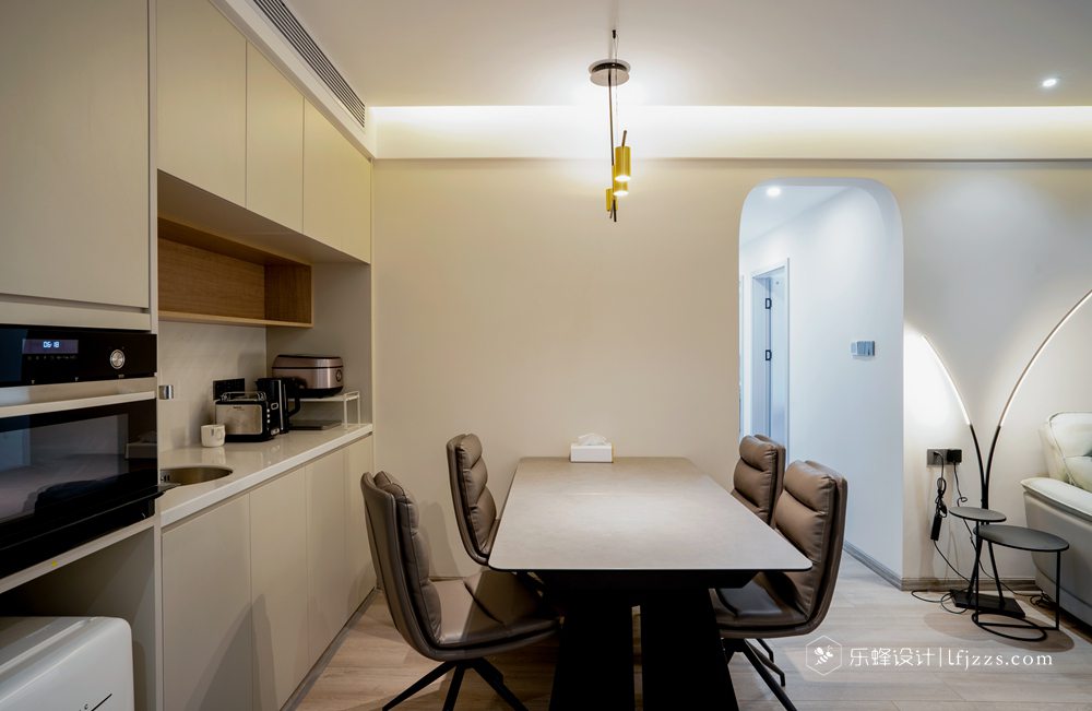 餐廳左側設計一套餐邊柜,與餐桌椅結合,形成西廚區;設計簡易,功能豐富。