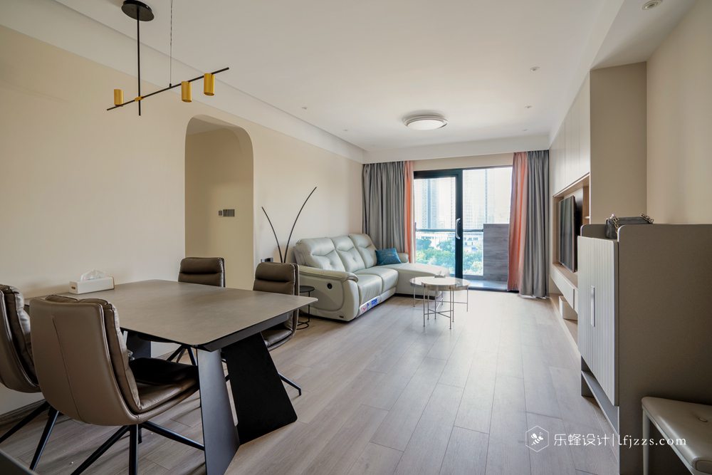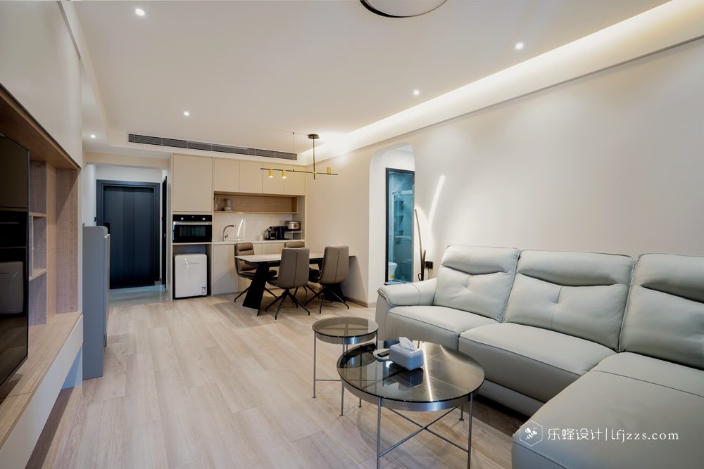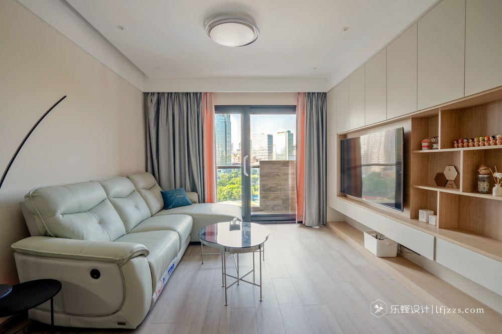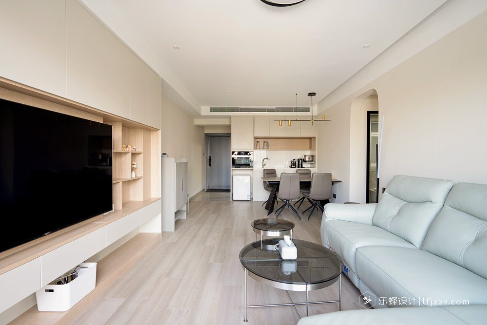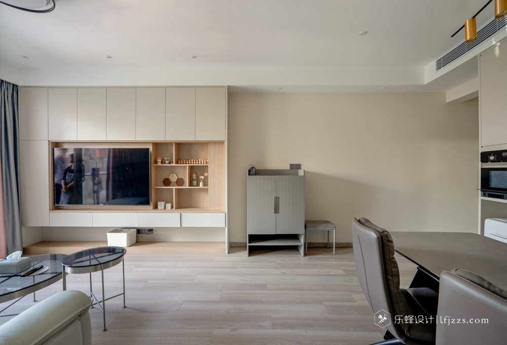 客廳將柜體設計成與墻面一樣的顏色,頂天立體設計,用反彈器開關代替傳統把手,減少柜體存在感。
