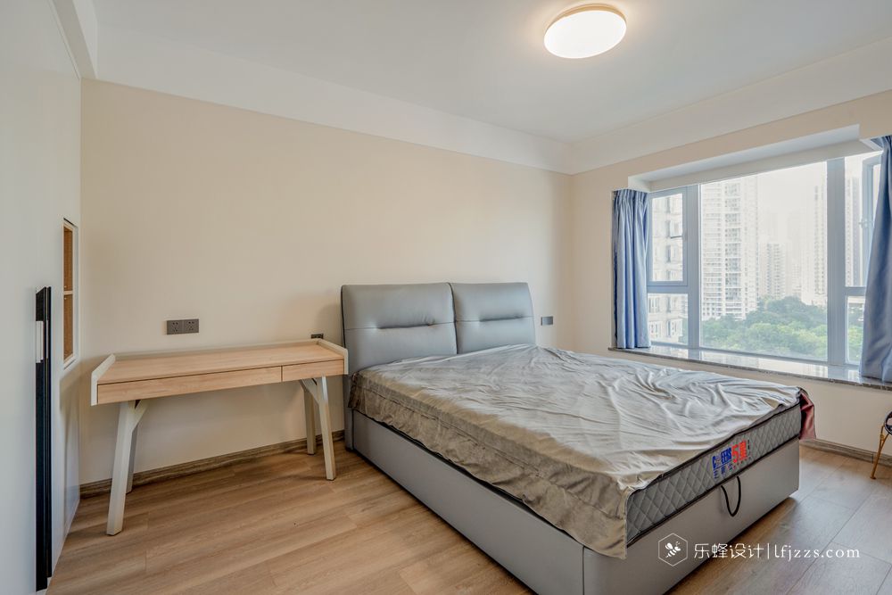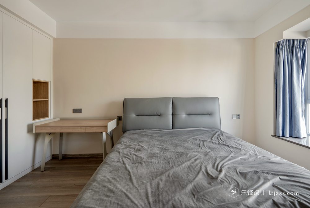 臥室延續整體風格,配色清新時尚;定制的原木桌代替了床頭柜,衣柜設計多了兩格放置包包的位置。
