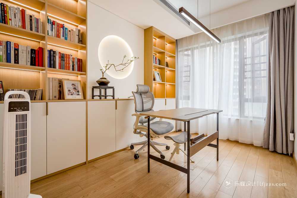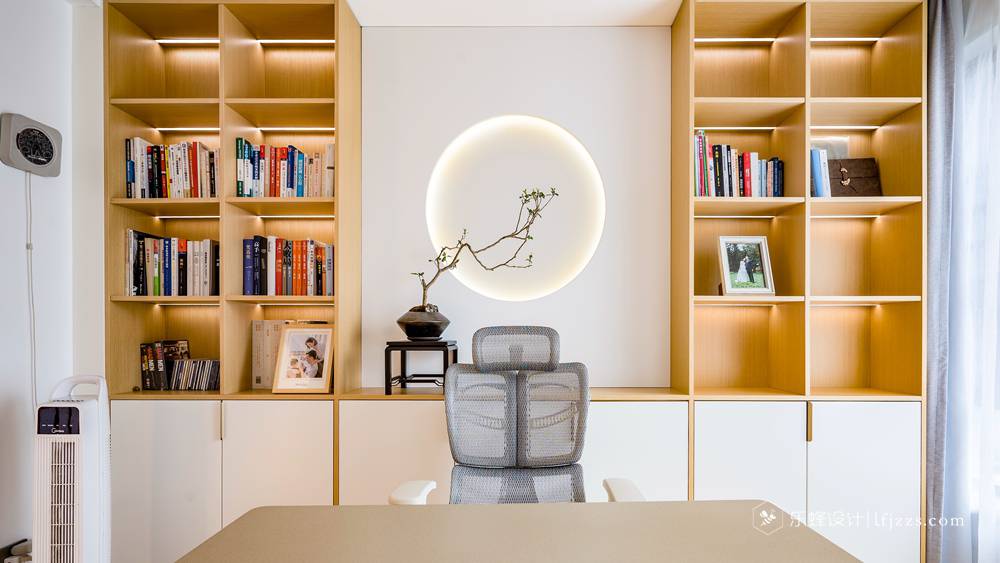 - 書房實景圖 - 書房沿用整體的空間色彩原木風(fēng),沒有刻意的設(shè)計很多東西,在書桌后面設(shè)計一整排的書柜,方便平時的一些書籍拿取。亮點的話就是書柜中間用日式特點隔開,在放在一個綠植點綴,完美。