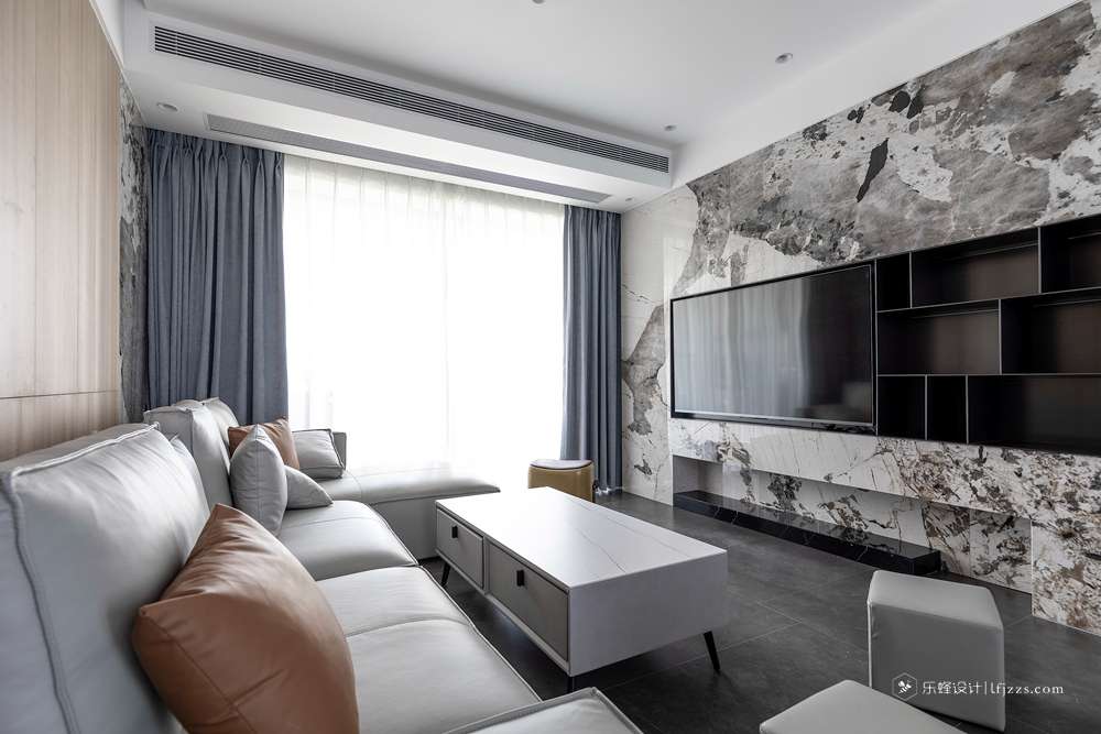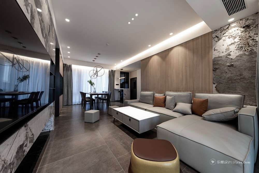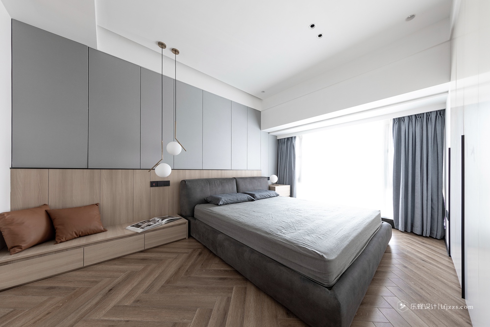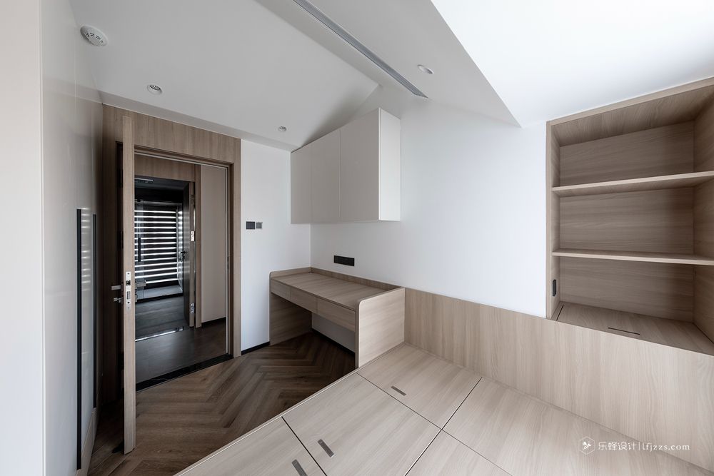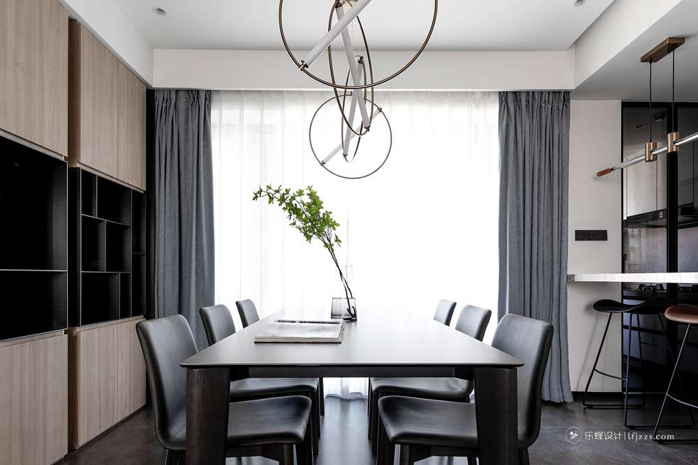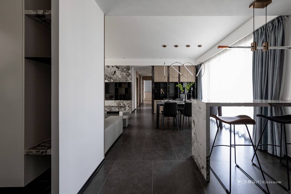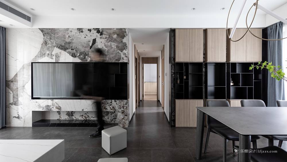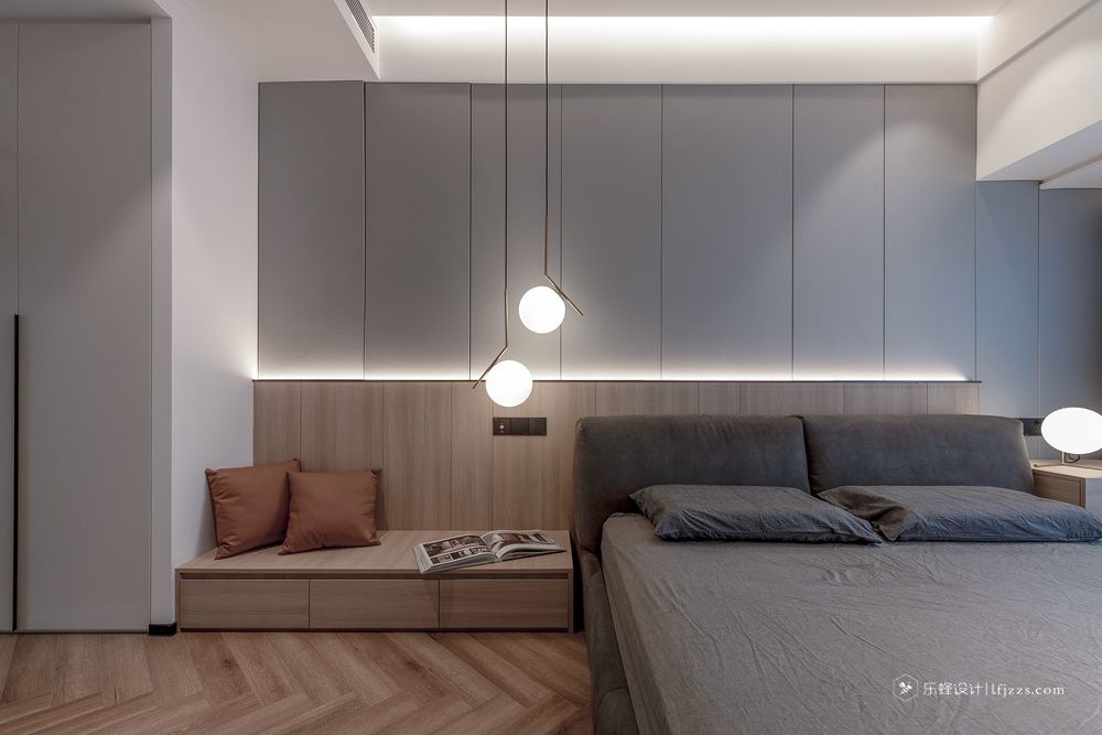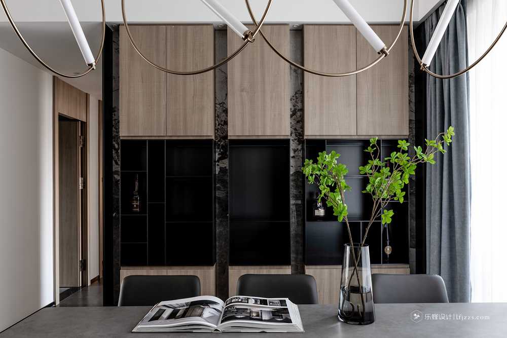 干凈利落的處理手法,讓整個空間一下子變得高檔起來。電視背景墻打破傳統,大板奢石上墻,給整個空間賦予了靈魂。中間的黑色不銹鋼框從電視背景墻貫穿到餐邊柜。整體把電視背景整體拉長。餐邊柜的中間放置神臺位置,中間搭配上燈光的點綴。滿滿的高級感。主臥把床頭的飄窗柜門和電視背景整個做成一個整體。拉長空間感的同時拉升美感。