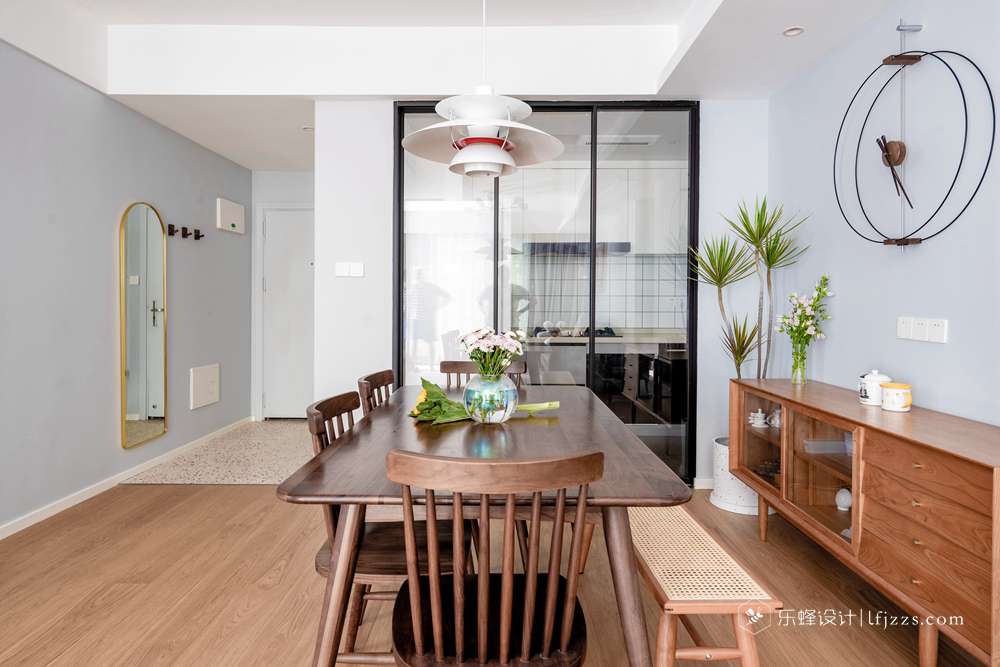 從玄關(guān)進(jìn)來是客餐廳,首先看客廳,在玄關(guān)區(qū)域延伸過來的藍(lán)色乳膠漆承擔(dān)了客廳墻面裝飾的任務(wù),它的出現(xiàn)讓客廳的色彩不再單調(diào);地面采用溫潤(rùn)的木地板作為材料,它不像瓷磚那般冰冷。