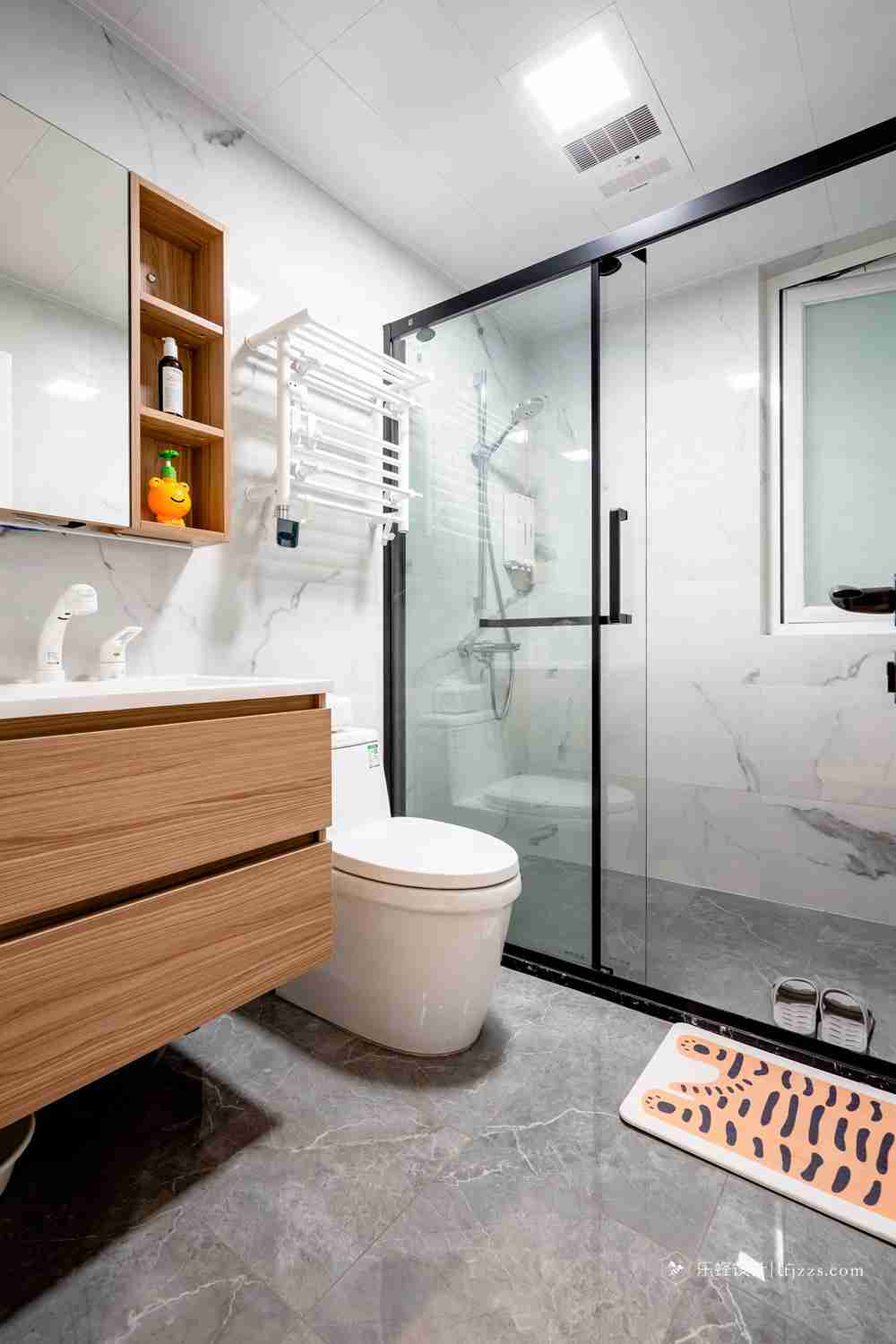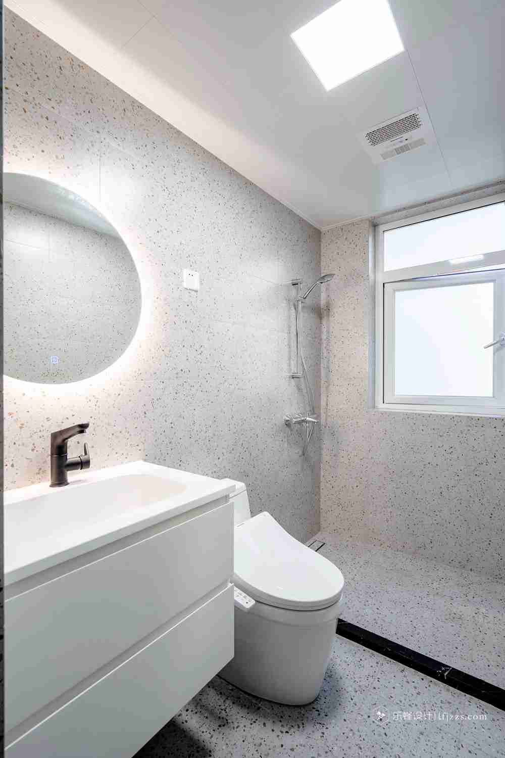 主臥衛(wèi)生間則更注重設(shè)計(jì)感,墻面地面通鋪水磨石瓷磚,浴室柜的鏡后燈也能很好營(yíng)造氛圍,淋浴區(qū)做長(zhǎng)條形隱藏式下水口整體性更好,后期在掛上ins風(fēng)的浴簾,妥妥的設(shè)計(jì)模板!