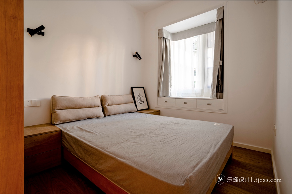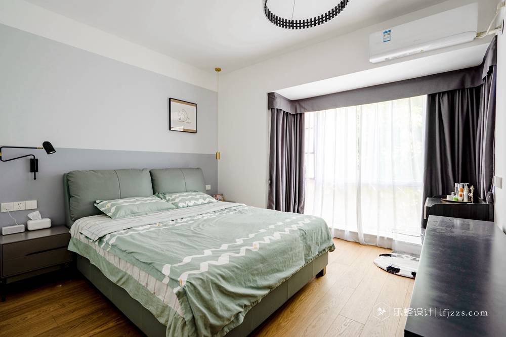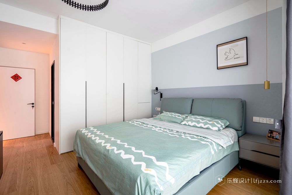 主臥室背景通過上下乳膠漆分色結(jié)合白色的單眼皮吊頂來營(yíng)造設(shè)計(jì)感,衣柜通過巧妙的設(shè)計(jì)避開了床頭柜位置打不開的情況,床頭的吊燈和壁燈也能增強(qiáng)空間氛圍感和方便日常閱讀,我發(fā)現(xiàn)屋主酷愛不對(duì)稱的設(shè)計(jì),掛畫也掛到一邊,個(gè)性十足啊!