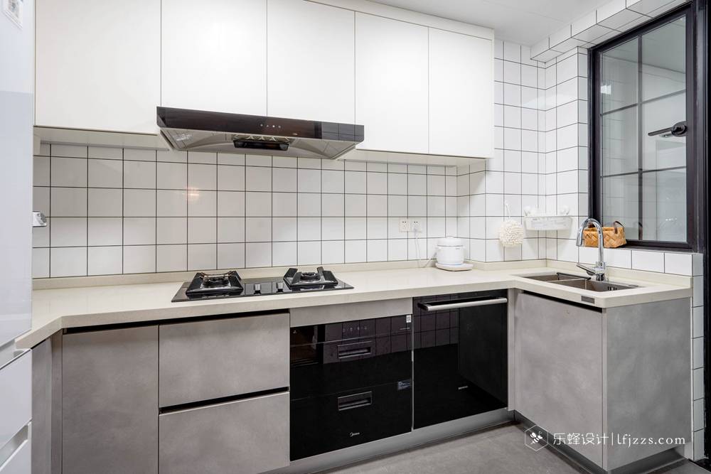 廚房地面貼啞光地磚,考慮防滑的同時(shí)也更顯質(zhì)感,墻面則是能讓空間更加輕松愉悅的小白磚,櫥柜配色也是上淺下深和瓷磚一起形成上下配色的關(guān)系,7字櫥柜在很大程度上滿足了廚房操作和儲(chǔ)物的需求。