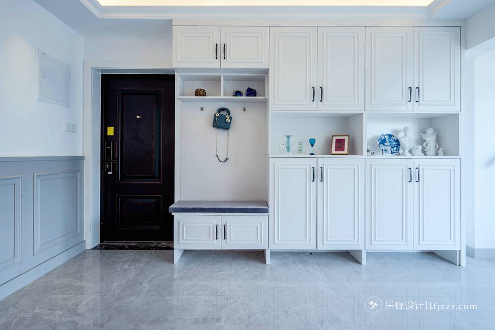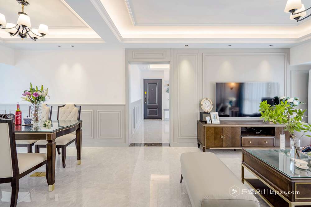 美式田園風格有它獨有的美感,入戶門廳的門套和電視背景的飾面相結合,顯得電視背景墻的跨度被拉長,空間的尺度感覺更加開闊,兩者也同屬一個設計平面,更加整體。