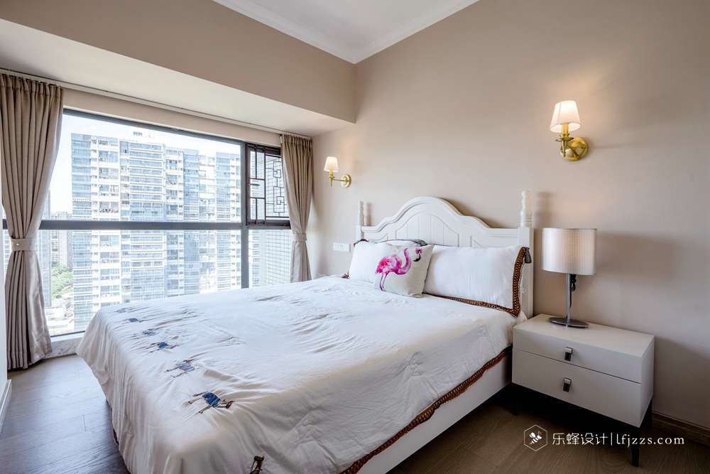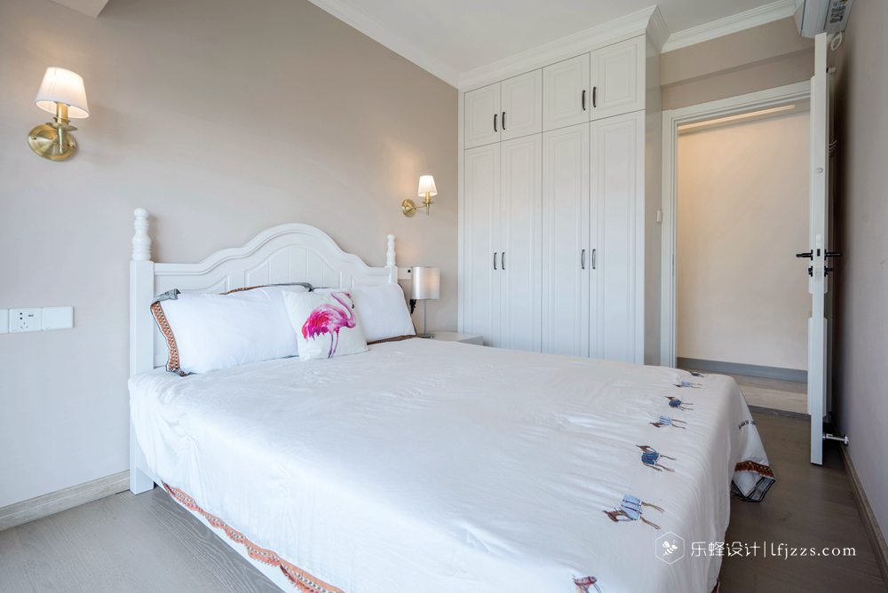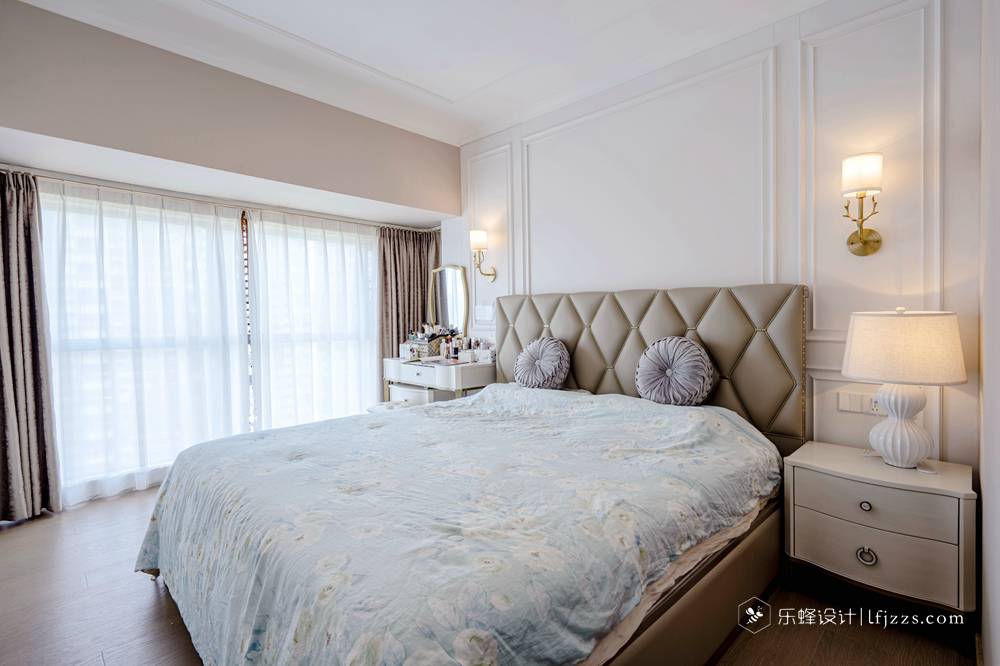 作為美式空間的主臥室,我們更加強調氛圍感,通過護墻板和燈光的搭配來營造出不同的是氣氛。這樣顯得床頭背景更加的素雅,沒有太多贅余的裝飾。