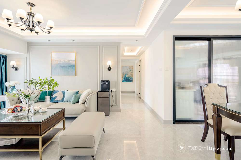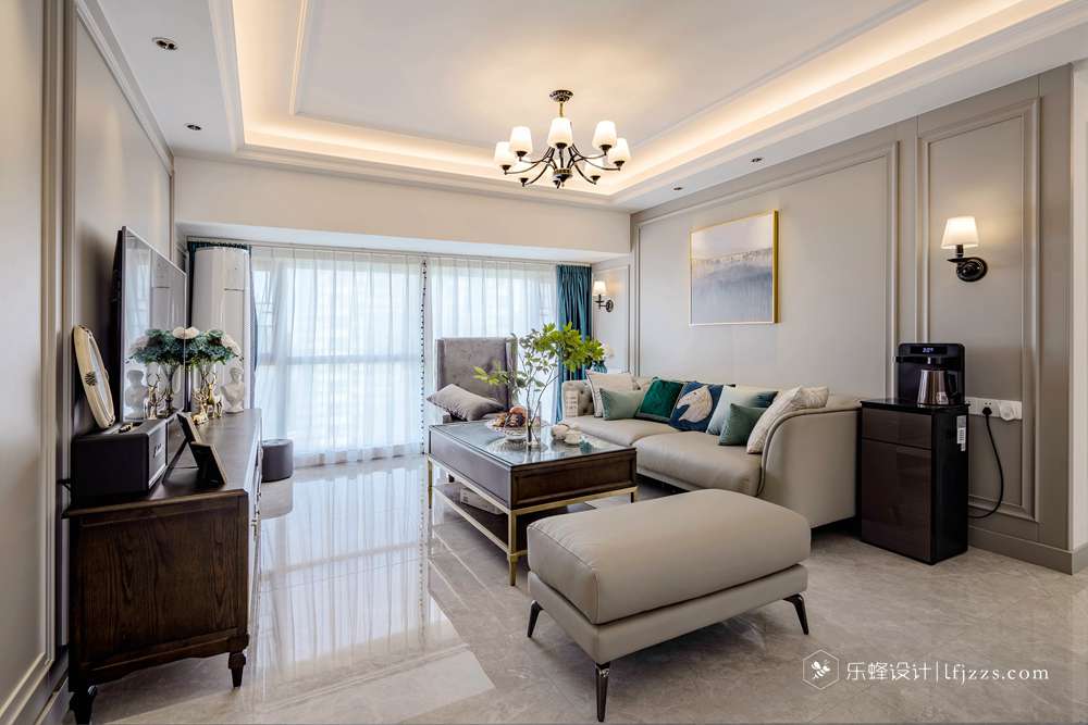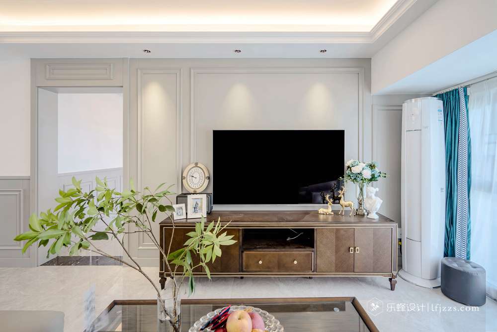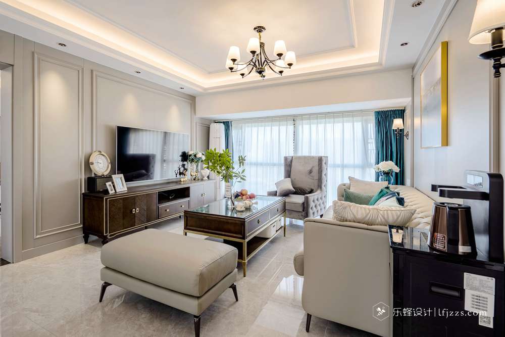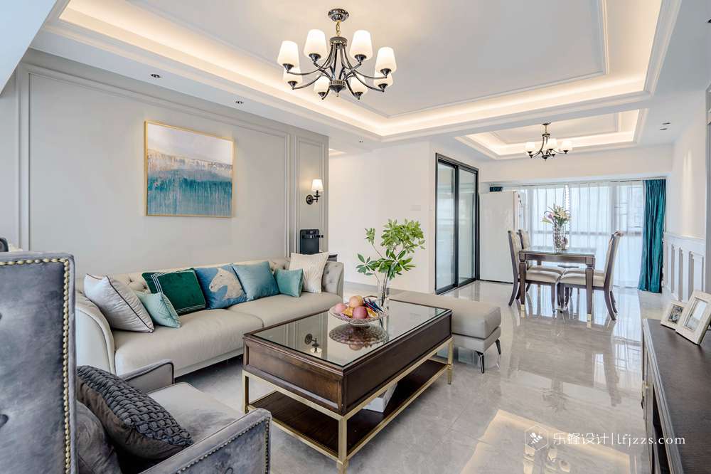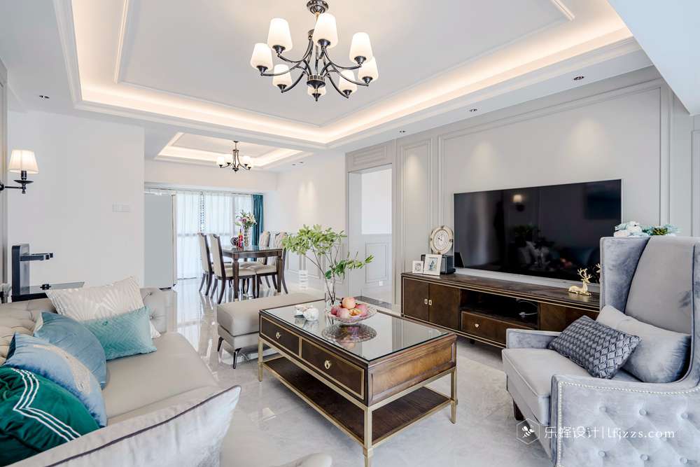客廳整體的家具格調都屬于輕美式的,因為美式家具會比較大,所以選用了高腳的,不直接落地,不顯得笨重,吊頂也相較傳統的美式風格做了簡化。